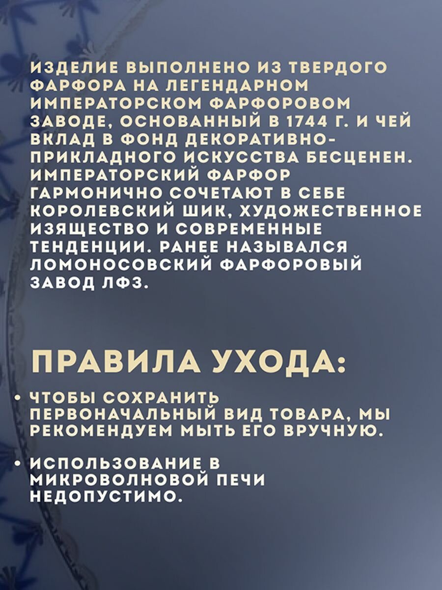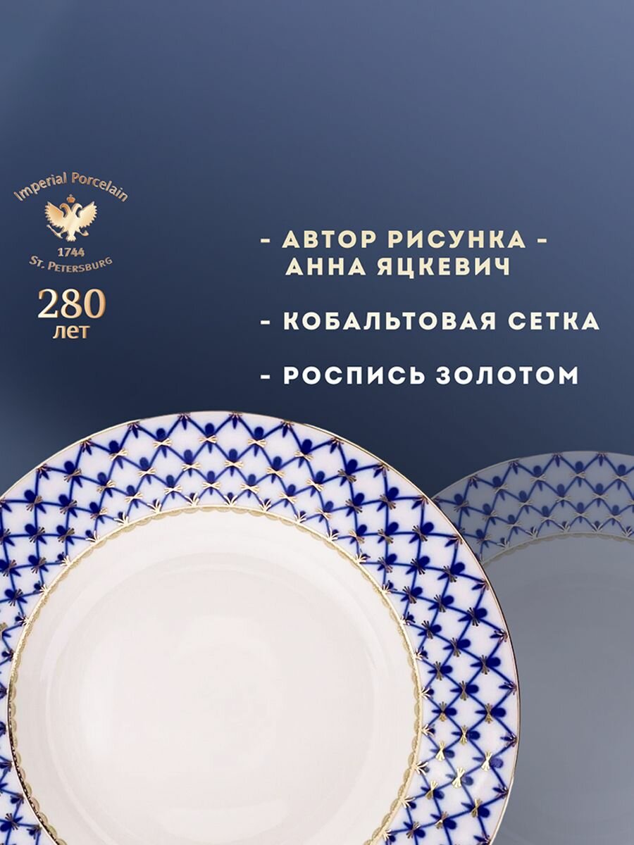 Изделие выполнено на легендарном Императорском фарфоровом заводе, основанном в 1744 г. и чей вклад в фонд декоративно-прикладного искусства бесценен. Императорский фарфор гармонично сочетают в себе королевский шик, художественное изящество и современные тенденции. Подходит для супа и пасты. Новинка 2017 года. Твердый фарфор, подглазурная деколь, отводка золотом. Автор рисунка - Анна Яцкевич. Диаметр - 22.5 см. Рекомендуем мыть вручную. Рисунок Кобальтовая сетка был создан в конце 1944 года художником Анной Яцкевич. Нет достоверных данных, что именно послужило для художника прообразом созданного рисунка. Возможно, роспись Собственного сервиза, созданного Д. И. Виноградовым в 1750-х годах, возможно мотивы сервиза Венской фарфоровой мануфактуры, хранившиеся в фондах заводского музея. Некоторые источники указывают, что это ассоциации с переклеенными крест на крест блокадными окнами ленинградских домов. Потребовались пять лет труда технологов и мастеров завода чтобы решить и преодолеть все технологические проблемы и тонкости подглазурной росписи кобальтом. В 1950 году ученица Анны Яцкевич - О. С. Долгушина под ее руководством исполнила окончательный вариант росписи сервиза, который был внедрен в производство. В 1969 году сервиз Кобальтовая сетка был удостоен Знака качества СССР. В 1990-х годах заслуженный художник Галина Шуляк, непревзойденный мастер росписи кобальтом, переложила рисунок Кобальтовая сетка на столовые и другие предметы. Позднее рисунок стали наносить на предметы из тонкостенного костяного фарфора. В настоящее время Кобальтовая сетка выпускается более чем на 100 наименованиях изделий завода и является одним из самых популярных рисунков завода и визитной карточкой не только самого завода, но и Санкт-Петербурга.