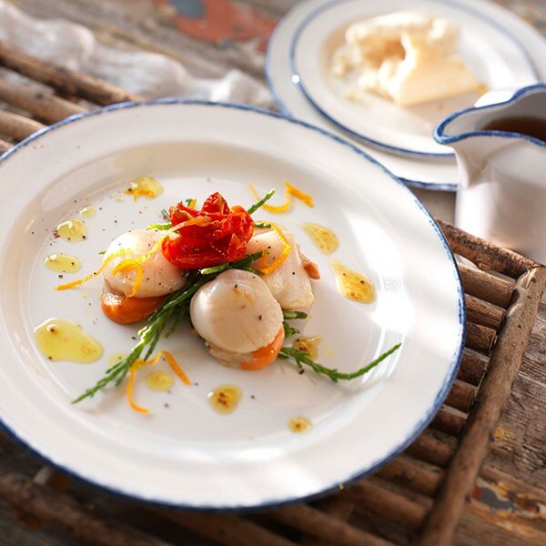 Тарелка подходит для использования в микроволновой печи и посудомоечной машине, выполнена из высококачественного фарфора, имеет гладкую поверхность и стильный дизайн с синим ободком.