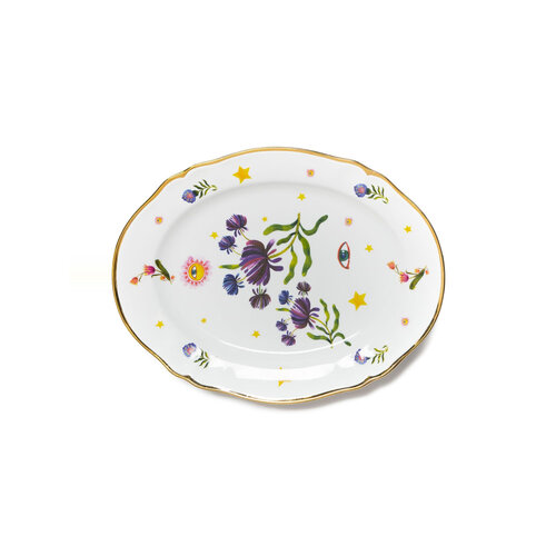 Цвет слоновой кости, разноцветный, фарфор, овальная форма, контрастные края и сплошной цветочный принт.