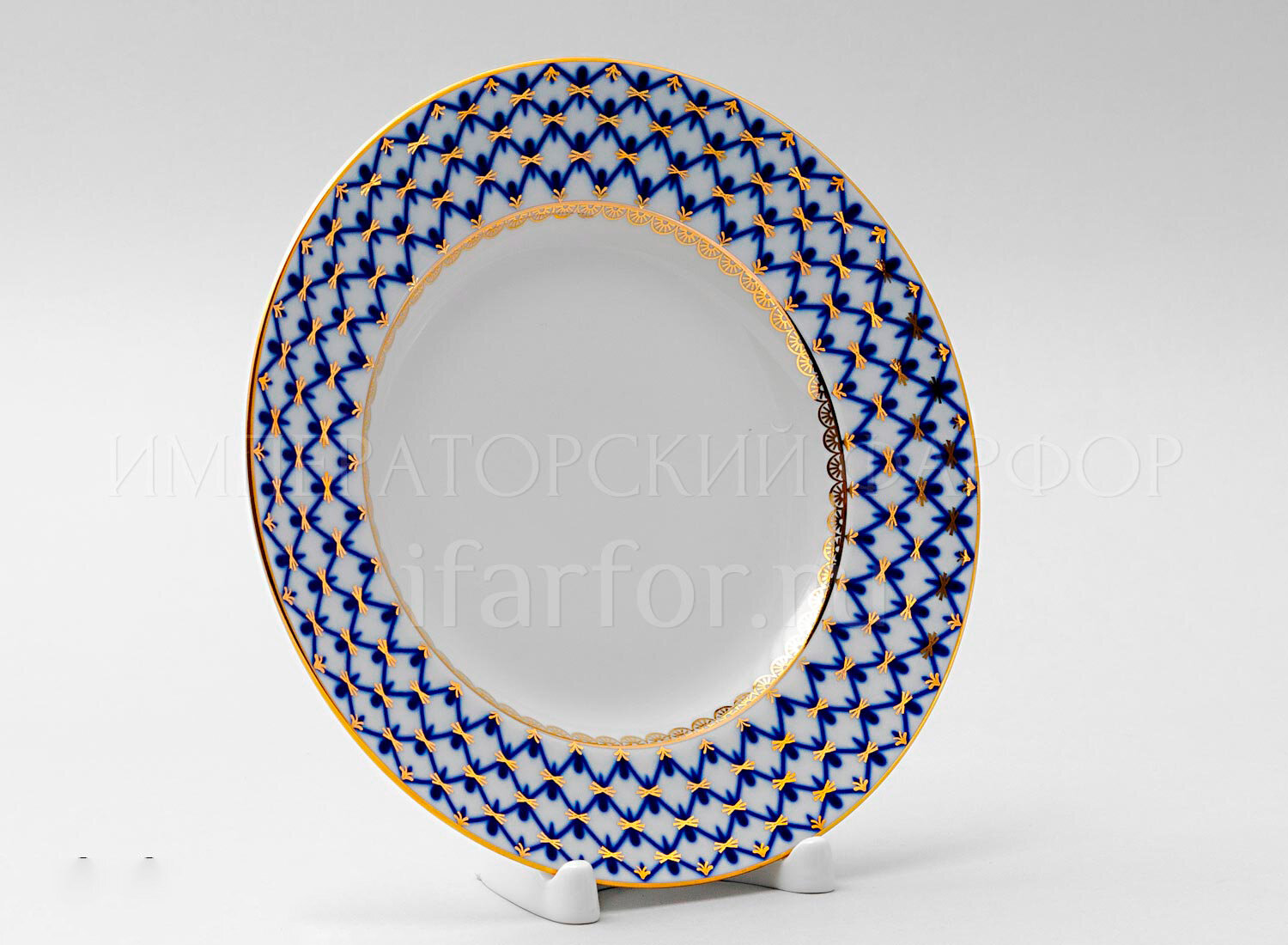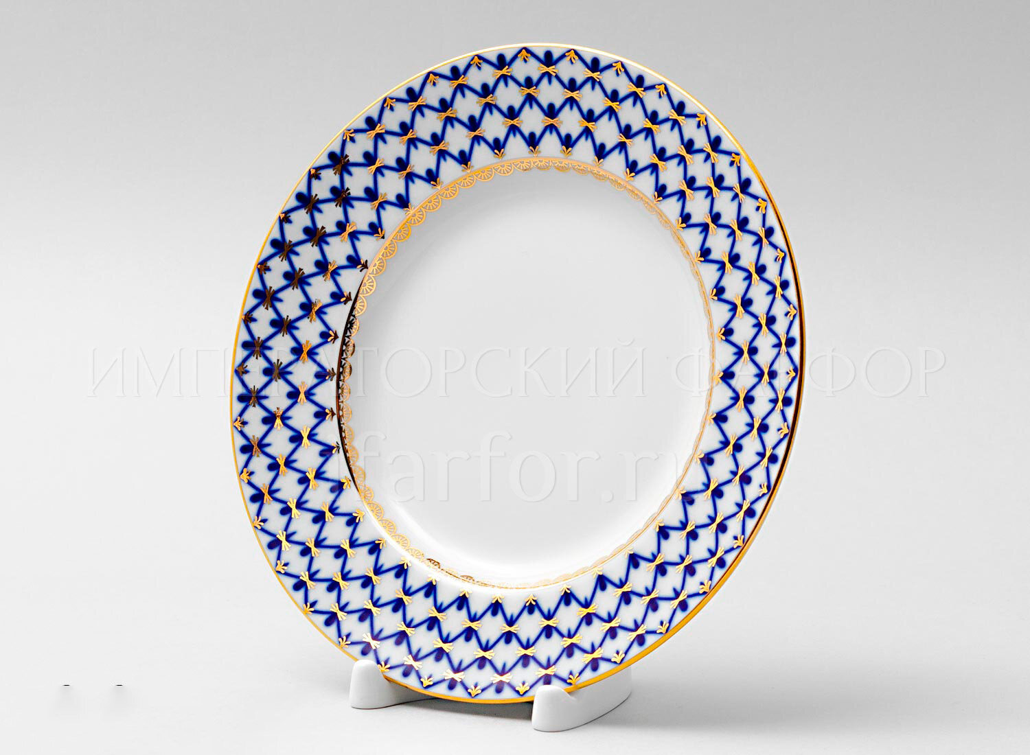 Тарелка мелкая Кобальтовая сетка ; Форма: Гладкая; Изделие изготовлено из материала: Твердый фарфор; Диаметр: 200 мм; Автор формы: Яковлева Серафима Евгеньевна; Автор росписи: Яцкевич Анна Адамовна; Производитель: Императорский фарфоровый завод (ИФЗ, ЛФЗ), Россия;