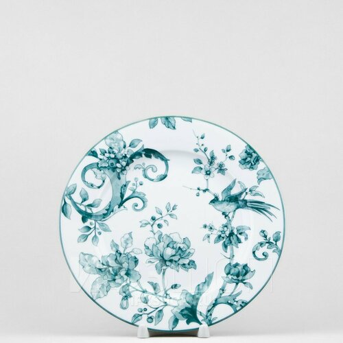 На тарелке нет ничего лишнего, только утонченный рисунок, распустившийся на белоснежной глади материала. В изысканном декоре угадываются мотивы шинуазри: дивные цветы и птицы, исполненные в благородном изумрудном оттенке. Автор рисунка - Sabine Chenneviere /Кварнберг.