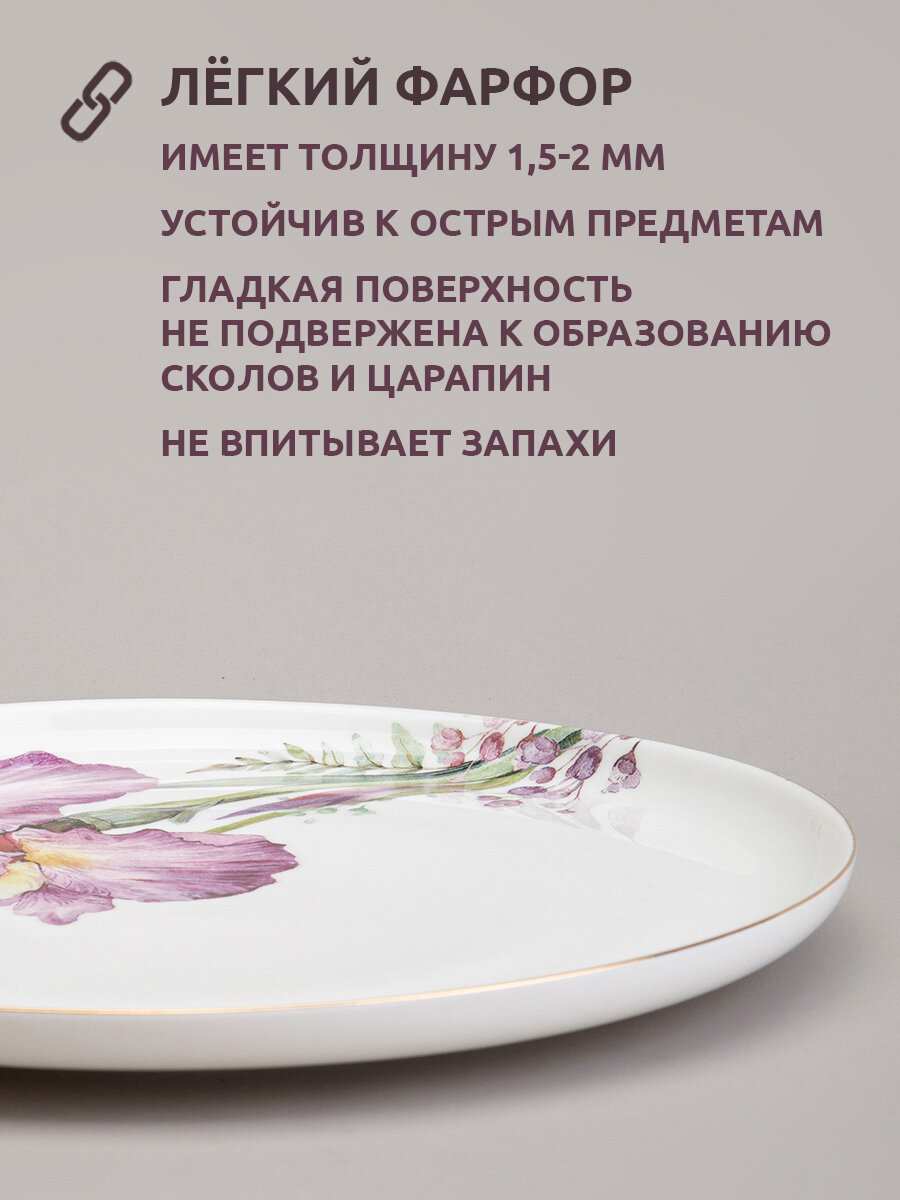 Тарелки изготовлены из белоснежного тонкостенного фарфора, что придает им легкость и ощущение весеннего настроения. Акварельные зарисовки сиреневых ирисов на белом фоне создают атмосферу уюта и свежести. Золотая отводка добавляет изысканности и завораживает своим блеском.