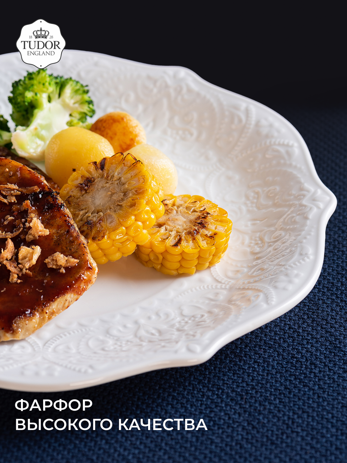 Обеденные тарелки TUDOR ENGLAND серии Royal Whitehall отличаются элегантным дизайном, который придется по вкусу и ценителям классики, и тем, кто предпочитает утонченность и изысканность. Предназначены для подачи вторых блюд, закусок, нарезок для сервировки стола. Посуда имеет диаметр 23 см, удобна и практична в использовании в повседневной жизни, а также станет украшением праздничного стола. Изделия имеют ажурный край. Нежный ажурный рисунок украшает каждое изделие. Этот удивительный набор посуды включает в себя 6 фарфоровых плоских тарелок, которые станут отличным подарком для вашей мамы, жены или на новоселье. Элегантный дизайн и прочность делают их идеальным выбором для ежедневного использования. Тарелки легко моются и безопасны для использования в посудомоечной машине и СВЧ. Комплектность: тарелки обеденные - 6 шт. Вы также можете дополнить этот набор другими элементами этой коллекции. Либо выбрать столовый сервиз на 6 персон в нашем каталоге Мы заботливо проверяем посуду перед доставкой и надежно упаковываем для бережной транспортировки. Для большей сохранности товар упакован в воздушно-пузырьковую пленку и дополнительный короб. Закажите тарелки набор прямо сейчас, чтобы радовать себя и близких не только качеством, но и изысканным внешним видом посуды!