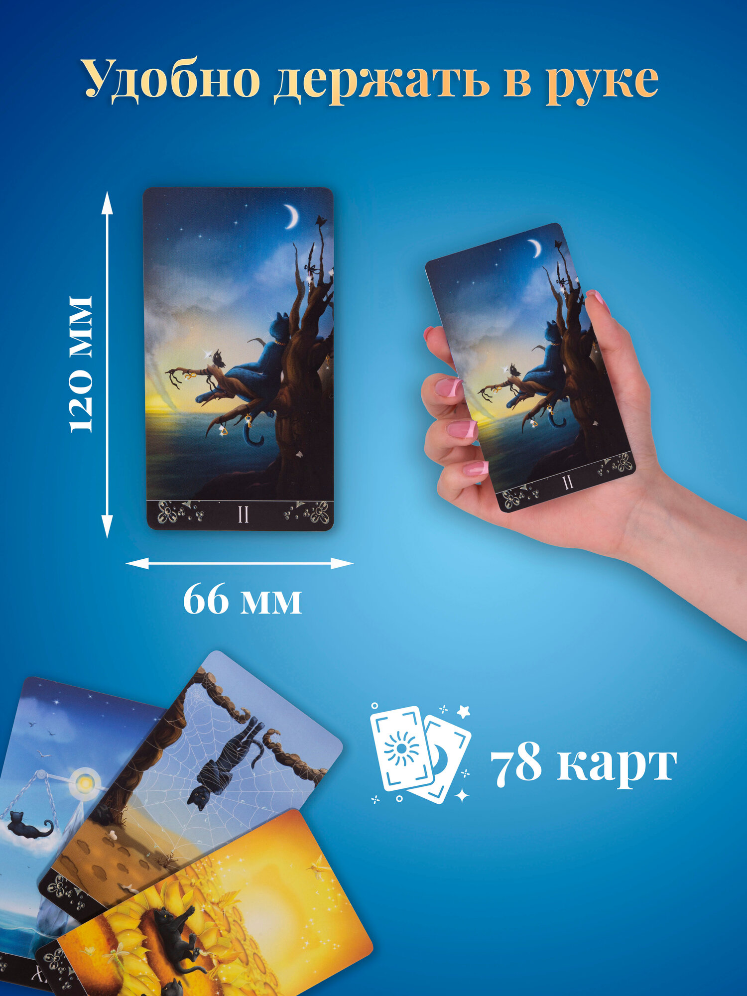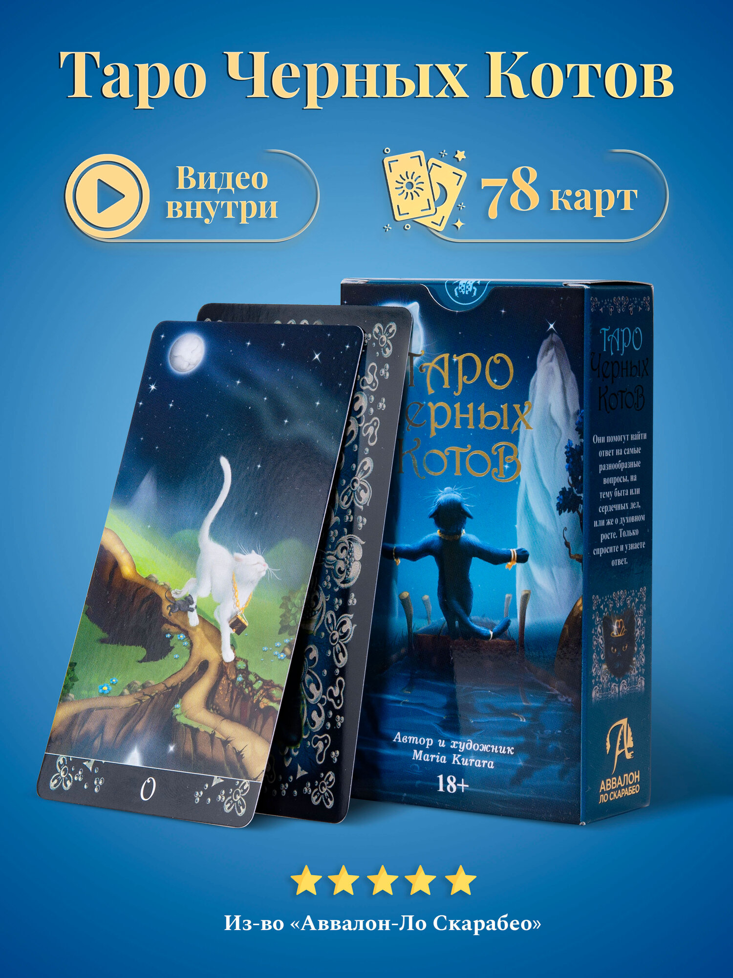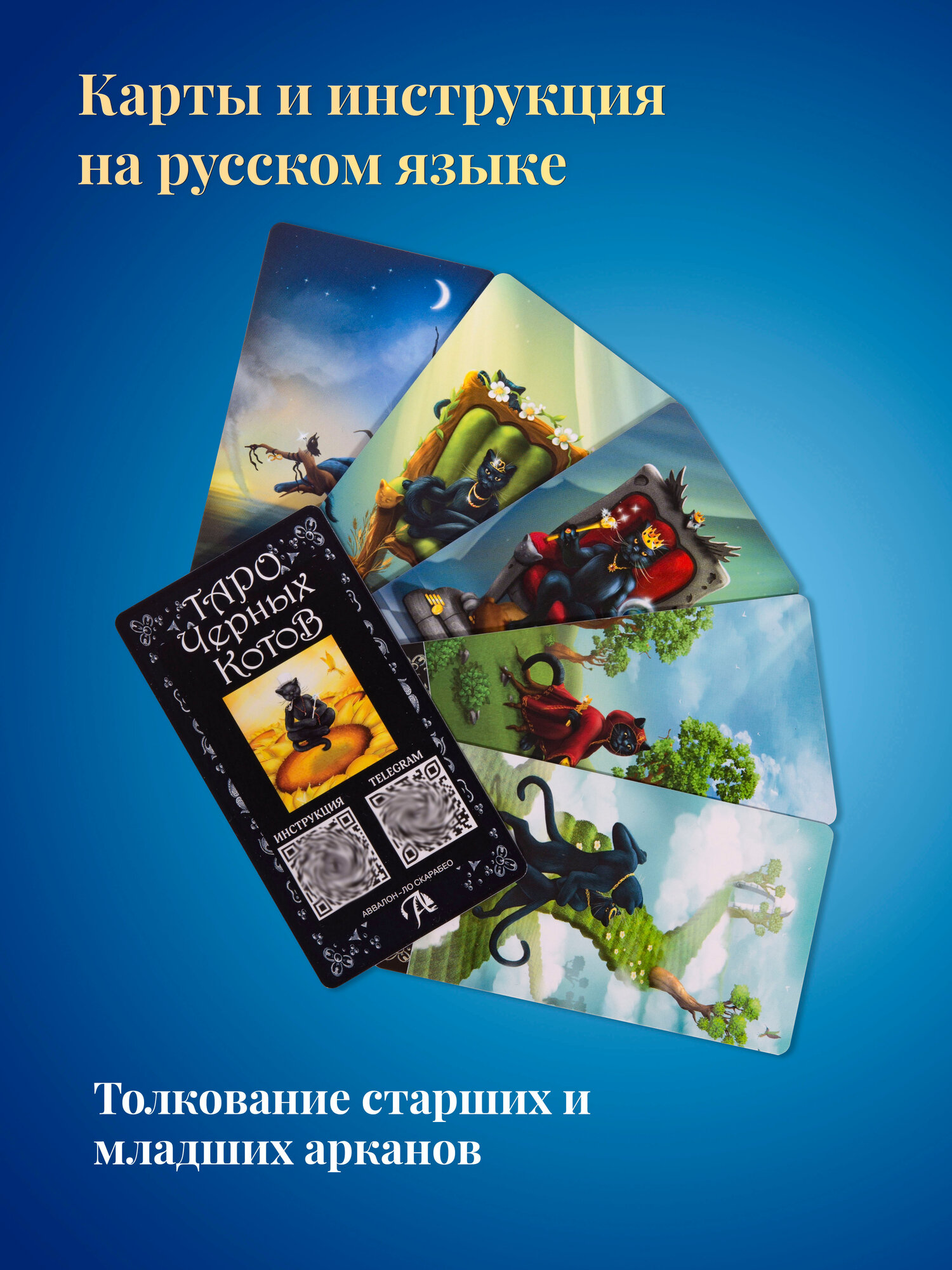 Гадальные Карты Таро Черных Котов символизируют связь с потусторонним миром. Что-то мистическое есть в черных котах, они связывают два мира и видят их одновременно, наш и тонкий мир духов. Черные Коты на картах намеренно имеют человеческий характер и человекоподобное строение тела, но не утратили своей животной природы, это поможет вам при толковании арканов, поможет провести ассоциацию с человеком и его жизнью. Преимущественно в колоде черные коты, хотя присутствуют так же и 2 белых. Эти коты имеют свое назначение и не меняют смысл колоды, а лишь дополняют и раскрывают его. Все 78 карт связаны с классическими традициями Райдера Уэйта, и совсем не похожи на Таро Тота Алистера Кроули. Классические гадальные карты отлично подойдут не только опытным, но и начинающим тарологам. Колода состоит из 78 карт, выполнены из высококачественного картона, в комплекте идет инструкция, прочный короб для хранения. Набор из универсальных таро карт станет отличным подарком подруге, женщине, любимой девушке и всем, кто увлекается магией, эзотерикой, гаданиями на любовь, метафорическими ассоциативными картами, картами оракул Ленорман. В нашем магазине вы так же можете приобрести: Таро Небо и Земля, Эротическое Таро Манара, Таро Безумной Луны, Колесо Года, 78 Дверей, Руны, книги и др. аксессуары эзотерики и магии. Издательство Lo Scarabeo (Италия) по заказу Аввалон-Ло Скарабео.