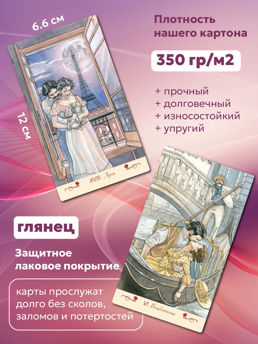 Каждая карта отражает эмоции, развеивает сомнения и дает советы влюбленным. Для более широкого охвата всех возможных вариантов любовных отношений создатели колоды выделили определенный период времени (конец 19-начало 20 века) и географию событий: 4 европейских города, которые считаются самыми романтичными и своеобразными - Венецию, Вену, Рим и Париж.