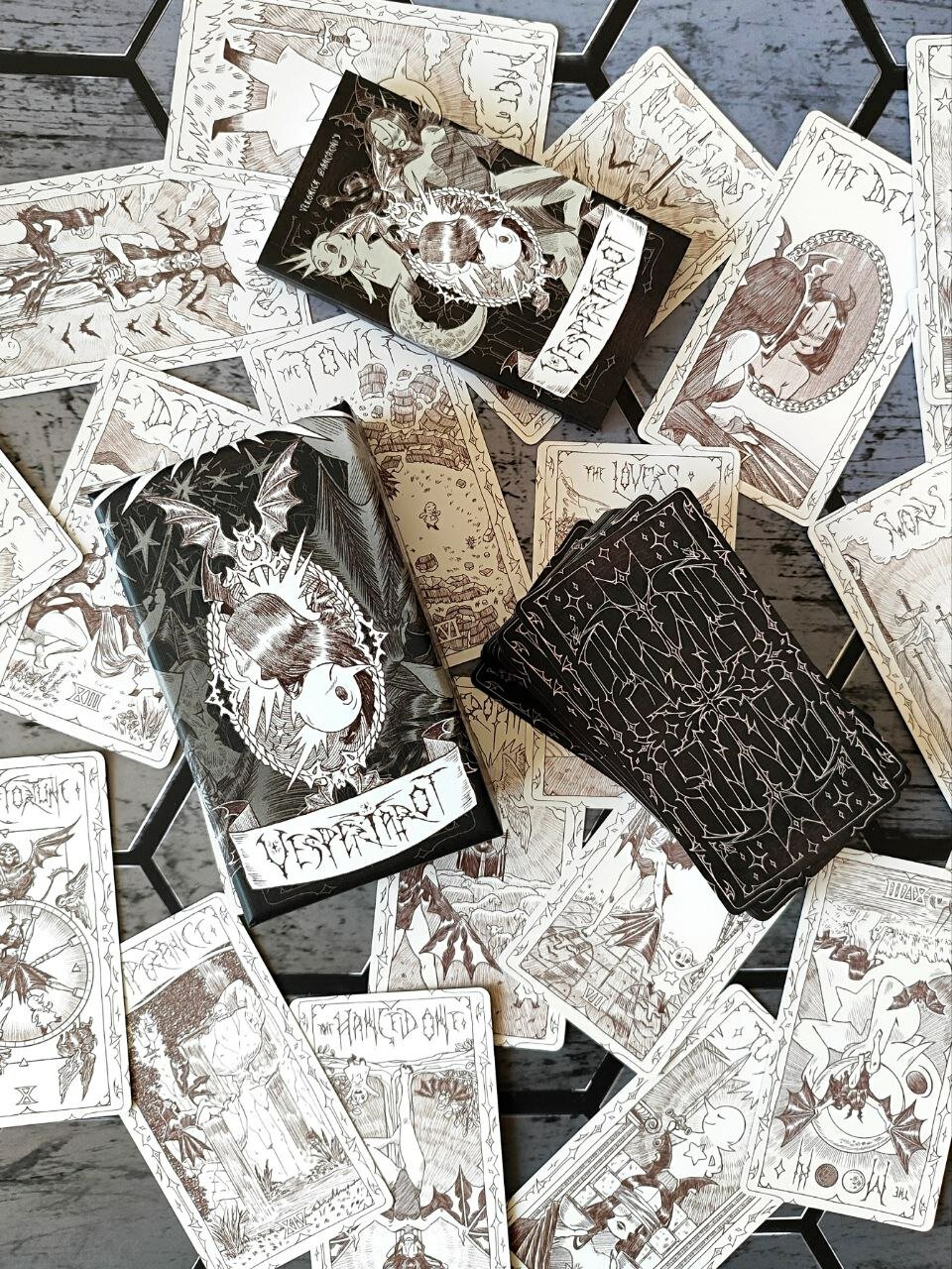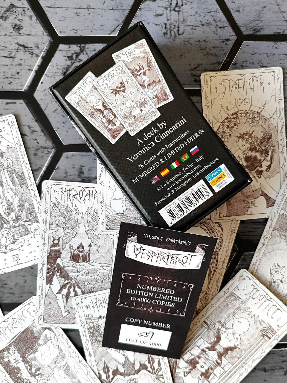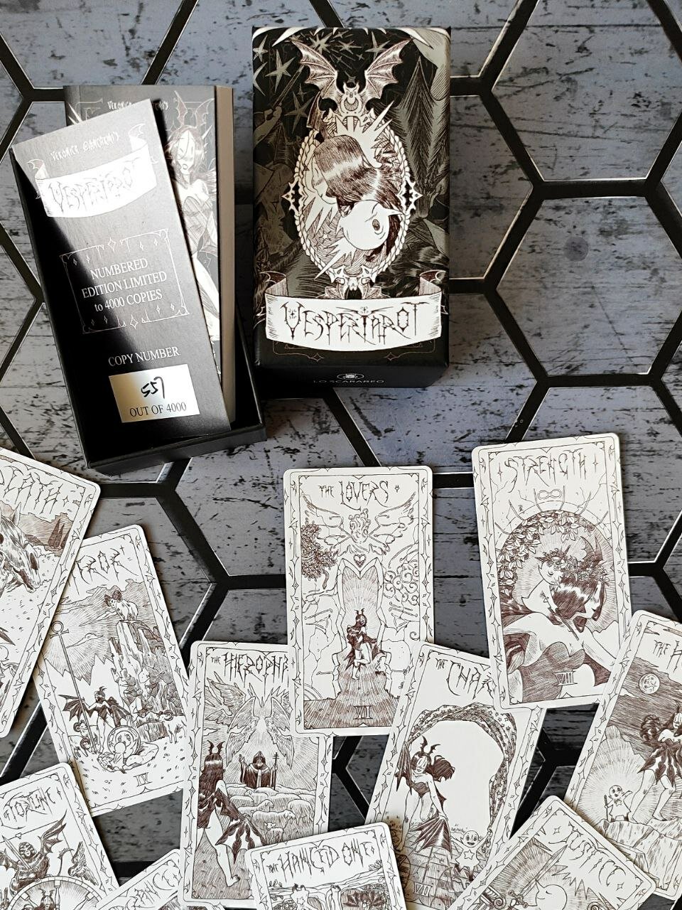 Колода Таро веспер рассказывает историю Веспертилиу, женщины-летучей мыши, которая решает отправиться в необычное приключение в компании Мацигиан, маленькой ведьмы, которая будет сопровождать ее в увлекательном путешествии по Арканам. Эта эксклюзивная повествовательная колода является частью серии Horizons от Lo Scarabeo: она выполнена карандашом в оригинальном черно-белом точечном стиле и предлагает опыт чтения во всех смыслах этого термина. Horizons — новая линейка Lo Scarabeo, эта великолепная колода, выпущенной ограниченным тиражом всего в 4000 экземпляров — первая в этой новой серии Таро. Подходит для бунтарей и альтернативных духов.