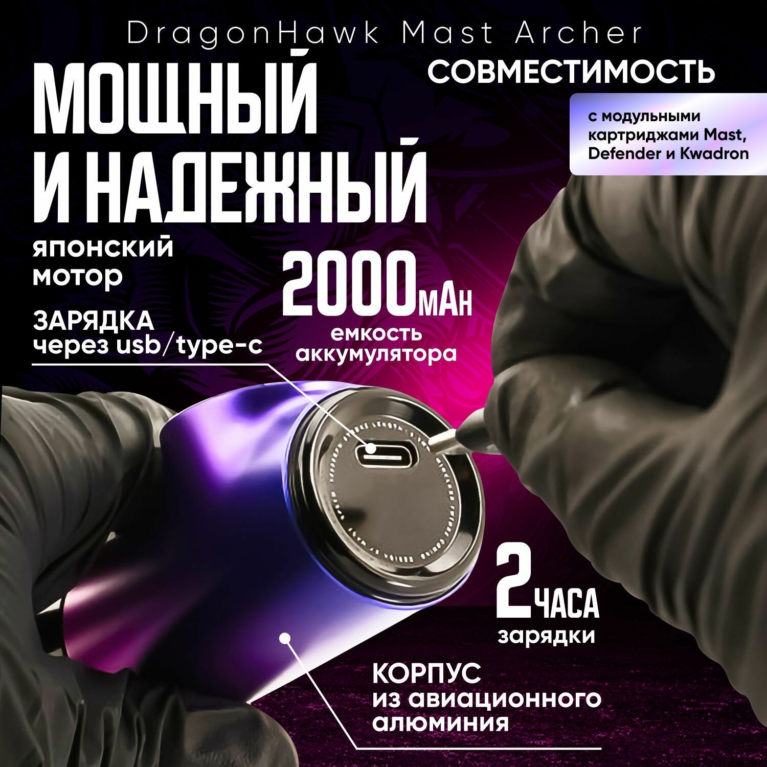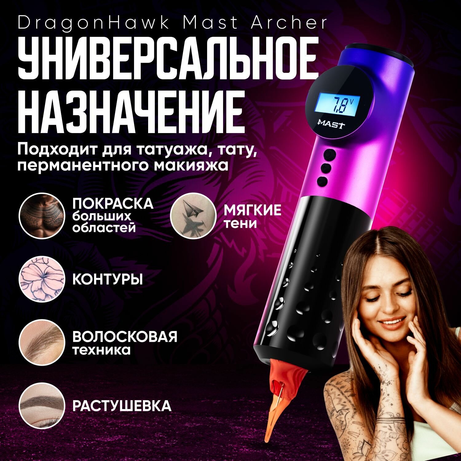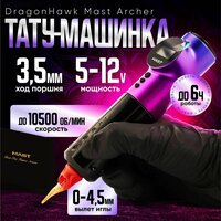 Тату машинка DragonHawk Mast Archer - это мощный инструмент, который позволяет эффективно и качественно выполнять различные татуировочные работы. Она изготовлена из прочного алюминия, что придает ей особую надежность и долговечность. Мотор Японии обеспечивает возможность работы на частотах до 10500 об/мин. Вольтаж можно настроить в диапазоне от 5 до 12 В для контурных работ и от 6 до 8 В для закраса и теней.