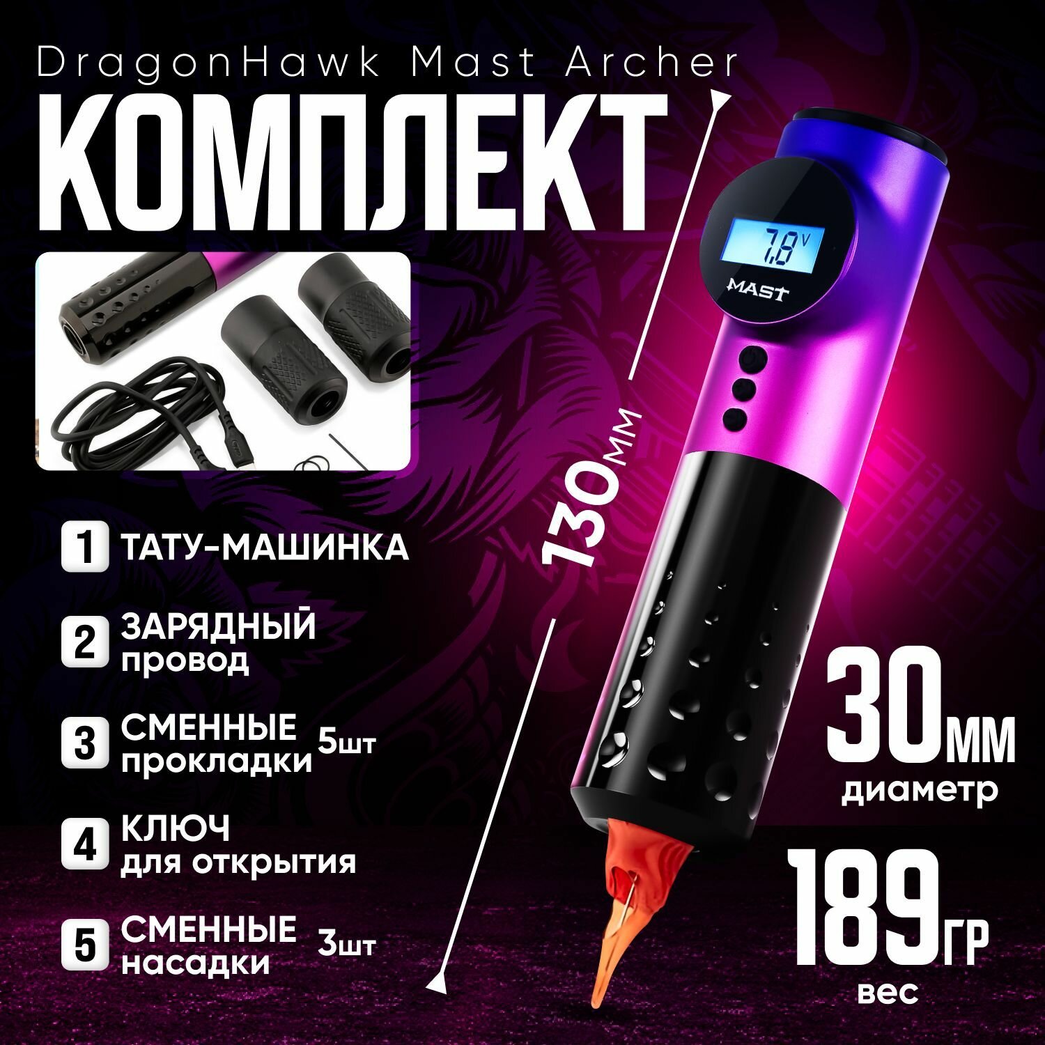 Длина тату машинки составляет 133 мм, а её вес - всего 189 г, что обеспечивает отличную маневренность, не нагружая руку мастера. Также инструмент совместим со всеми стандартными модульными картриджами Mast, Defender и Kwadron, что позволяет максимально расширить возможности татуировочного процесса. В целом, тату машинка DragonHawk Mast Archer является отличным выбором для любого профессионального татуировщика, который ценит высочайшее качество и продуктивность в работе.