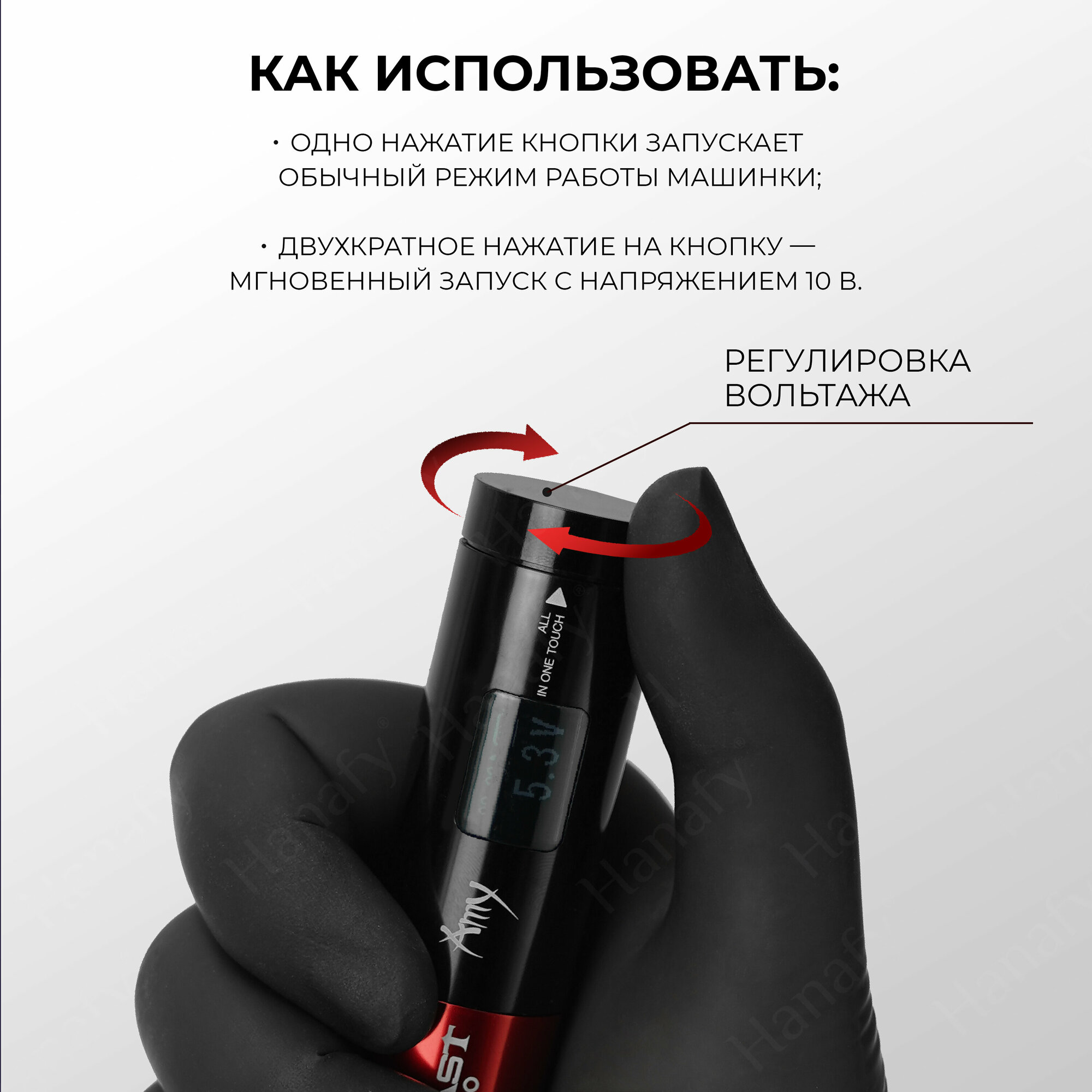 Беспроводная роторная машинка Dragonhawk Mast Tour AMY Wireless оснащена двигателем Custom Mast без сердечника — Mcore-c1 (увеличивает срок службы машины). Тончайший корпус (держатель всего 23 мм). Подойдёт для разных стилей татуировки и для всех зон перманентного макияжа. Два режима работы: работа с аккумулятором; работа с блоком питания (при разрядке машинки батарею можно заменить на разъем RCA). Как использовать: одно нажатие кнопки запускает обычный режим работы машинки; двухкратное нажатие на кнопку — мгновенный запуск с напряжением 10 В. Характеристики: емкость аккумулятора - 750 мАч; время работы: 2–3 часа; длина аппарата - 138 мм; диаметр - 23 мм; ход иглы - 4 мм; рабочее напряжение: 4-12 В; скорость: 9 В/10400 об/мин; двигатель - Mast Special Edition без сердечника (Mcore-c1).