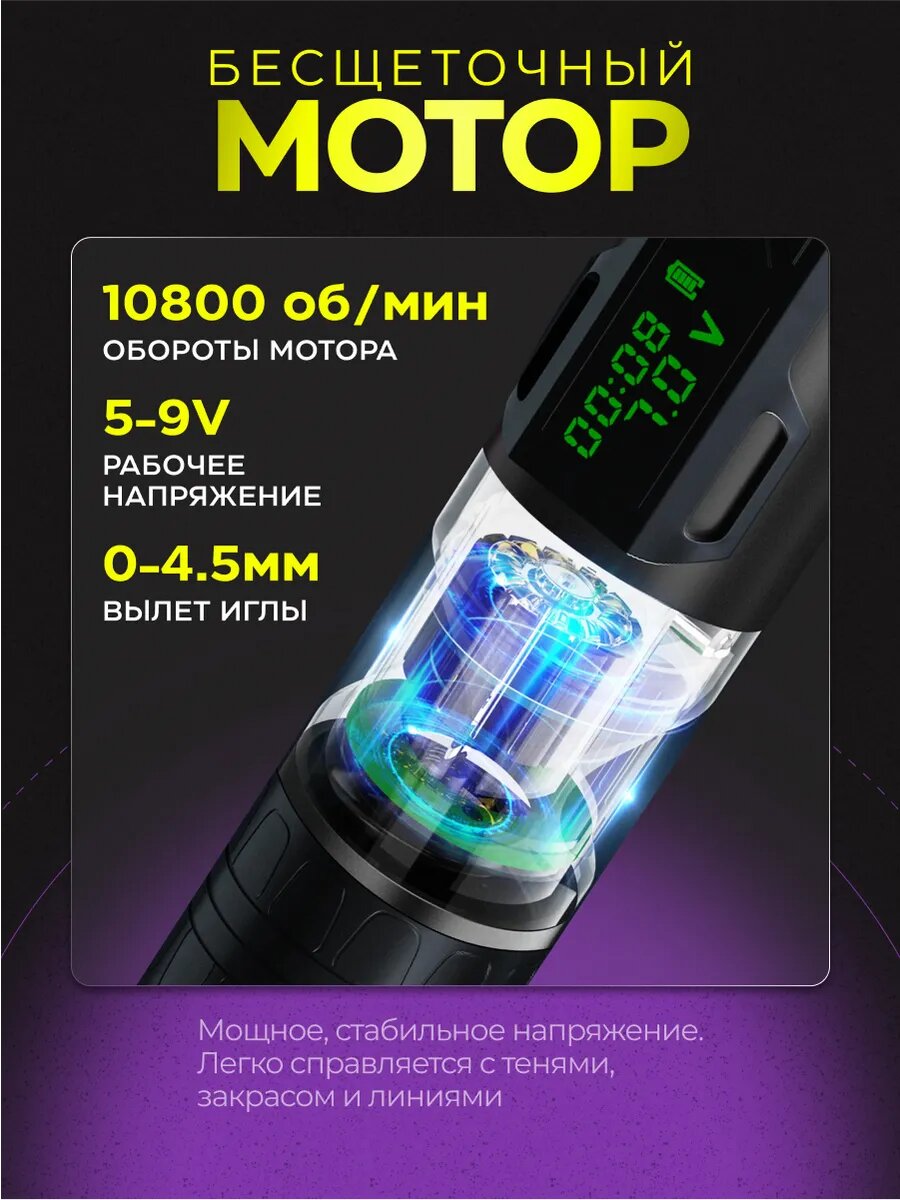 Модель подходит как для татуировок, так и для перманента — губ, бровей, век. Это надежный выбор для профессиональных мастеров, ценящих качество, стабильность и функциональность.