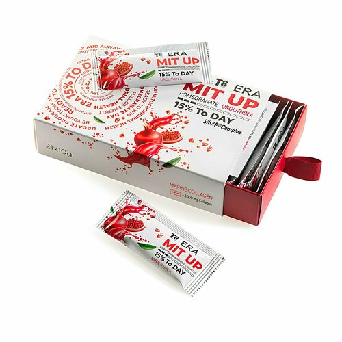 Т8 ERA MIT UP — это функциональный продукт на основе морского коллагена, экстракт граната (Уролитин А), витамина С и запатентованного SibXP®Complex, обеспечивающий приток сил и энергии, способствующий укреплению костей, хрящей, связок, сухожилий и стенок сосудов, сохраняющий молодость кожи, и поддерживающий здоровье митохондрий.