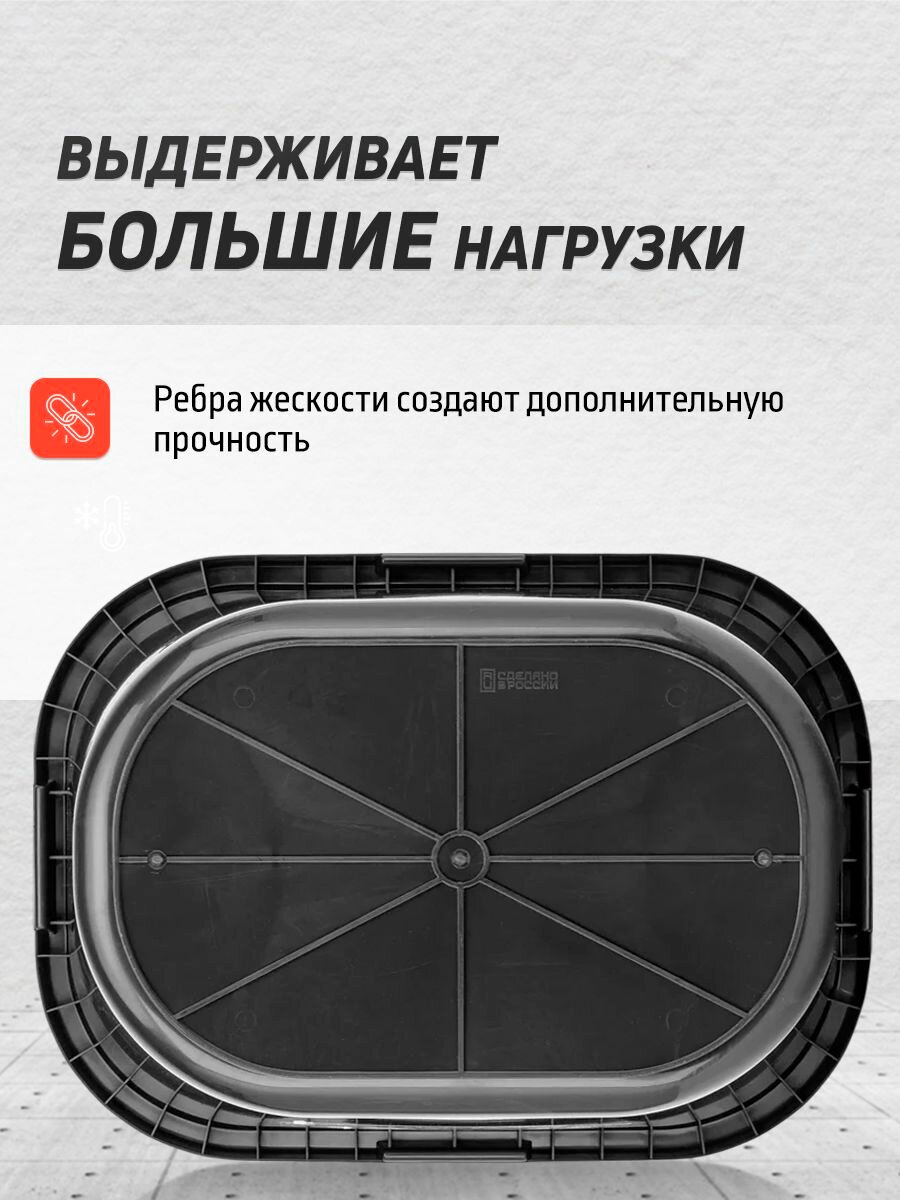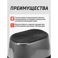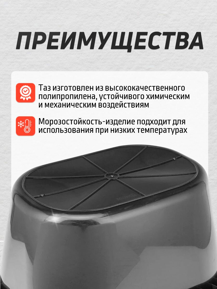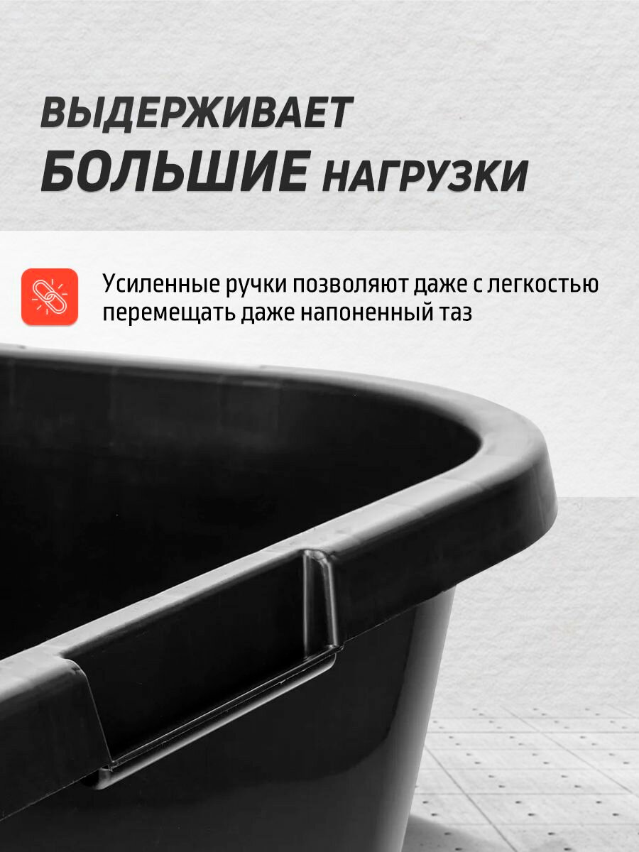 Изготавливаемый из ударопрочного материала, этот таз способен выдерживать значительные нагрузки и отлично справляется с защитой содержимого от механических повреждений. Ребра жесткости, интегрированные в конструкцию, добавляют дополнительную прочность и устойчивость, что особенно важно при выполнении серьезных строительных работ.