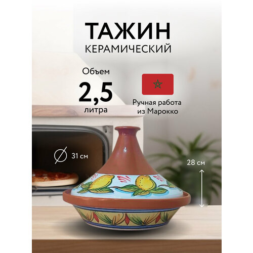 Тажин - форма для приготовления блюд из мяса и овощей, популярных в странах Магриба. Выбор гурманов и эстетов, для дома и кухни. Тажин объем 2,5 литра, диаметр 31 см. с отверстием в крышке. Идеально подходящий для медленного тушения и равномерного приготовления пищи. Керамика гарантирует правильный здоровый подход к кулинарии: любые блюда получаются ароматными и сохраняют все полезные вещества, не подвергаясь перепадам температур в процессе приготовления, наивкуснейших блюд с ароматным соблазном увлекут вас в мир кулинарных творений: тажин из мяса и овощей, золотистый плов и многое другое. Благодаря конусообразной форме крышки, пар, поднимающийся от готовящегося блюда, многократно конденсируется в верхней ее части и опускается вниз, поэтому мясо, рыба и овощи становятся очень нежными и приобретают особый вкус. Его можно помещать в духовку, в микроволновую печь и на любой источник нагревания, кроме индукционных плит.