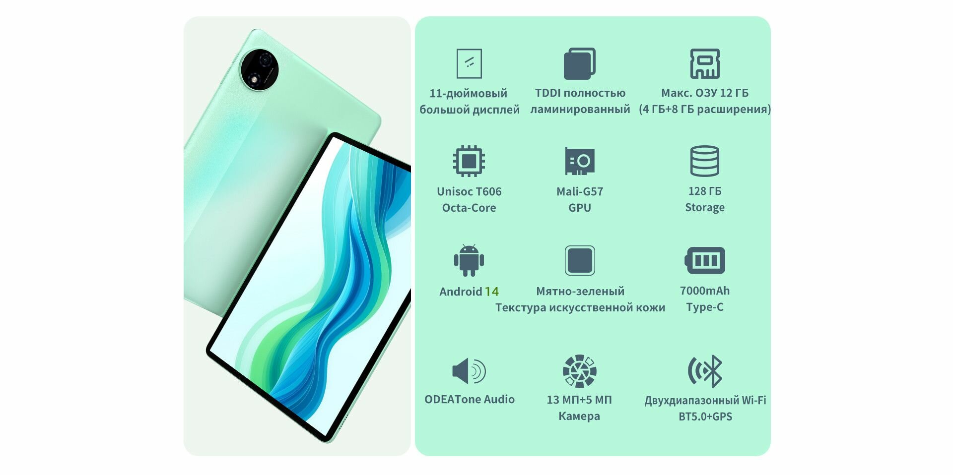 Teclast Планшет Odea A11, 11″ 4 ГБ/128 ГБ/Android15, оливковый Версия Wi — Fi не поддерживает SIM — карты