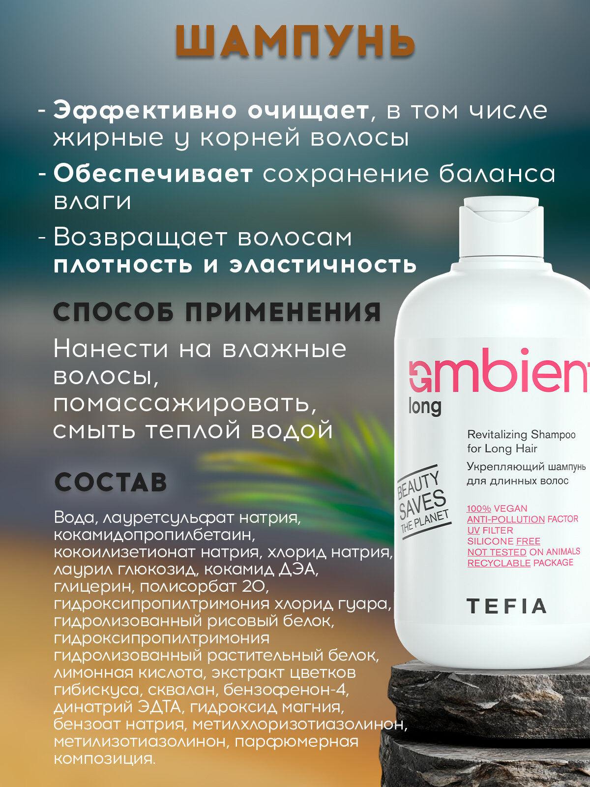 Набор для ухода за длинными волосам AMBIENT Long 3 в 1 включает в себя Укрепляющий шампунь 250 мл, Бальзам - кондиционер 250 мл, Спрей - распутыватель 250 мл. Укрепляющий шампунь для длинных волос - эффективно очищает длинные волосы, в т. ч. жирные у корней и сухие на кончиках. Дарит плотность и эластичность, предотвращает спутанность, ломкость и сухость. Содержит протеины риса и растительный кератин Kerashaft Q для укрепления и реконструкции по всей длине, растительный сквалан для интенсивного увлажнения и сохранения баланса влаги. Бальзам-кондиционер для длинных волос - обеспечивает сбалансированный уход за длинными волосами, интенсивно разглаживает и распутывает их по всей длине, существенно облегчая расчесывание. Протеины риса и растительный кератин Kerashaft Q укрепляют и реконструируют пористые, поврежденные участки волос. Растительный сквалан увлажняет, предотвращают сухость и спутанность волос. Спрей-распутыватель для длинных волос - мгновенно разглаживает и распутывает длинные волосы, облегчает расчесывание и укладку, придает гладкость и блеск. Не требует смывания! Растительный кератин, фосфолипидный комплекс и протеины риса восстанавливают, выравнивают и укрепляют поверхность волос по всей длине. Спрей сохранит баланс влаги, предотвратит сухость, ломкость и спутанность. AMBIENT long - профессиональная линия средств для восстановления поврежденных волос. Средства содержат масло конопли, обладающее мощным увлажняющим и восстанавливающим эффектом, масла ши и бабассу для придания мягкости, шелковистости и блеска. Tefia Ambient - знаменитый бренд профессиональной косметики для волос. Содержит полный ряд средств ухода за волосами. Уходовая профессиональная косметика Тефия abiet lon имеет спектр функций, оказывает очищающий, увлажняющий и укрепляющий, восстанавливающий и разглаживающий питательный эффект и обьем. Ассортимент Тефи эмбиент широко представлен продукцией для парикмахера и салона красоты, окрашивания и стрижки, благодаря чему Тэфия амбиент пользуется большой популярностью среди мастеров и стилистов. В нашем professional бренде вы найдете широкий выбор продуктов для блеска, сияния, восстановления и защиты, питания и увлажнения, очищения, укрепления ослабленных секущихся кончиков. Проф косметическое средство Теффия Ambien лон унисекс, как женский, так и мужской, подходит для всех типов волос - тонких, крашенных, светлых, блондинок, седых, тусклых, ломких, пористых, сухих и окрашенных волос, для блонда, осветленных и обесцвеченных, кудрявых и вьющихся, поврежденных и жирных. Забота для локонов, кутикулы и кожи головы, для женщин и мужчин, помогает вернуть волосам жизненную энергию и эластичность, укрепить их. Также в линиях нашего бренда Tefi Embient лонг Вы сможете найти продукты для легкого расчесывания, для придания прикорневого объёма и частого ежедневного применения, без силиконов и парабенов, уход с дозатором (на ряд средств покупается отдельно), и многое другое. Вы также найдете множество стайлинговых продуктов для укладки, в том числе создания и моделирования локонов, сухой фиксации самых разных причесок, разглаживания, стайлинг и тонирования, а также бустер густоты, термозащитный несмываемый антистатик от электризации, термозащита ( уф фильтр ), флюид, гель, воск, сыворотка, лосьон и несмывашка 15 в 1 для легкого расчесывания. Оттеночные тон