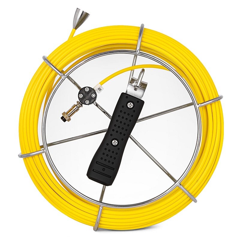 Особенности: 7" цветной дисплей Камера CCD с разрешением 1200ТВЛ, угол зрения 120 градусов, подсветка 12 белых светодиодов, диаметр камеры 23мм, водостойкость IP68 Катушка из нержавеющей стали с коннектором для монитора Кабель 20 м из стекловолокна с позолоченными контактами для камеры