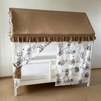 Ткань: 100% хлопок (поплин). В комплекте: ✅ Крыша текстильная на завязках (10 завязок, по 5 на каждую сторону) для кроватки домика: ✔ длина - 170 см; ✔ ширина - 137 см + 24 см на рюши (по 12 см на одну сторону). Боковой угол крыши открытый.