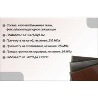 Физико-механические показатели: Состав: хлопчатобумажная ткань, фенолформальдегидное связующее. Плотность: 1.3-1.4 гр/куб. см Прочность на изгиб, не менее: 210 МПа Прочность на отслаивание, не менее: 7.5 МПа Предел прочности на разрыв, не менее: 24 МПа Рабочая t° от -40°C до +105°C