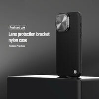 Оригинальный текстурный защитный чехол черного цвета от Nillkin серия Textured Prop Magnetic с защитной металлической крышкой для защиты задней камеры и функцией поддержки магнитной беспроводной зарядки MagSafe (для зарядки необходимо использовать индукционный магнит MagSafe)! на смартфон Айфон 15 Про. Новая серия чехлов от Nillkin Textured Prop Magnetic отличается возможностью закрывать камеру на смартфоне iPhone 15 Pro, когда она не используется. Чехол изготовлен из прочного и долговечного материала из очищенного нейлонового волокна, текстурированный чехол отличается превосходным качеством изготовления. Инновационная конструкция подставки для крышки объектива обеспечивает как защиту объектива, так и поддержку телефона. В сочетании с подушками безопасности для защиты от падения по четырем углам, обеспечивающими защиту от ударов и падения. Добавленный противоскользящие полоски по бокам, чтобы сделать его более устойчивым и удобным в использовании.