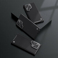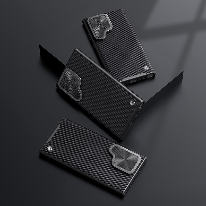 Оригинальный текстурный защитный чехол черного цвета от Nillkin серия Textured Prop Case с защитной металлической крышкой для защиты задней камеры на смартфон Самсунг Галакси С24 Ультра. Новая серия чехлов от Nillkin Textured Prop Case отличается возможностью закрывать камеру на смартфоне Samsung Galaxy S24 Ultra, когда она не используется. Чехол изготовлен из прочного и долговечного материала из очищенного нейлонового волокна, текстурированный чехол отличается превосходным качеством изготовления. Инновационная конструкция подставки для крышки объектива обеспечивает как защиту объектива, так и поддержку телефона. В сочетании с подушками безопасности для защиты от падения по четырем углам, обеспечивающими защиту от ударов и падения. Добавленный противоскользящие полоски по бокам, чтобы сделать его более устойчивым и удобным в использовании.