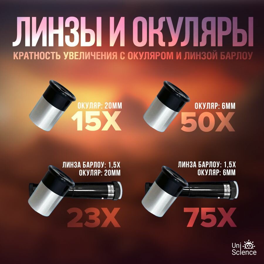 | Комплектация | * Труба телескопа * Штатив * Окуляр 6 мм * Окуляр 20 мм * Линза Барлоу * Фильтр лунного света * Зенитное зеркало * Видеоискатель 5*24 * Инструкция Z926 |