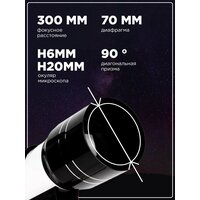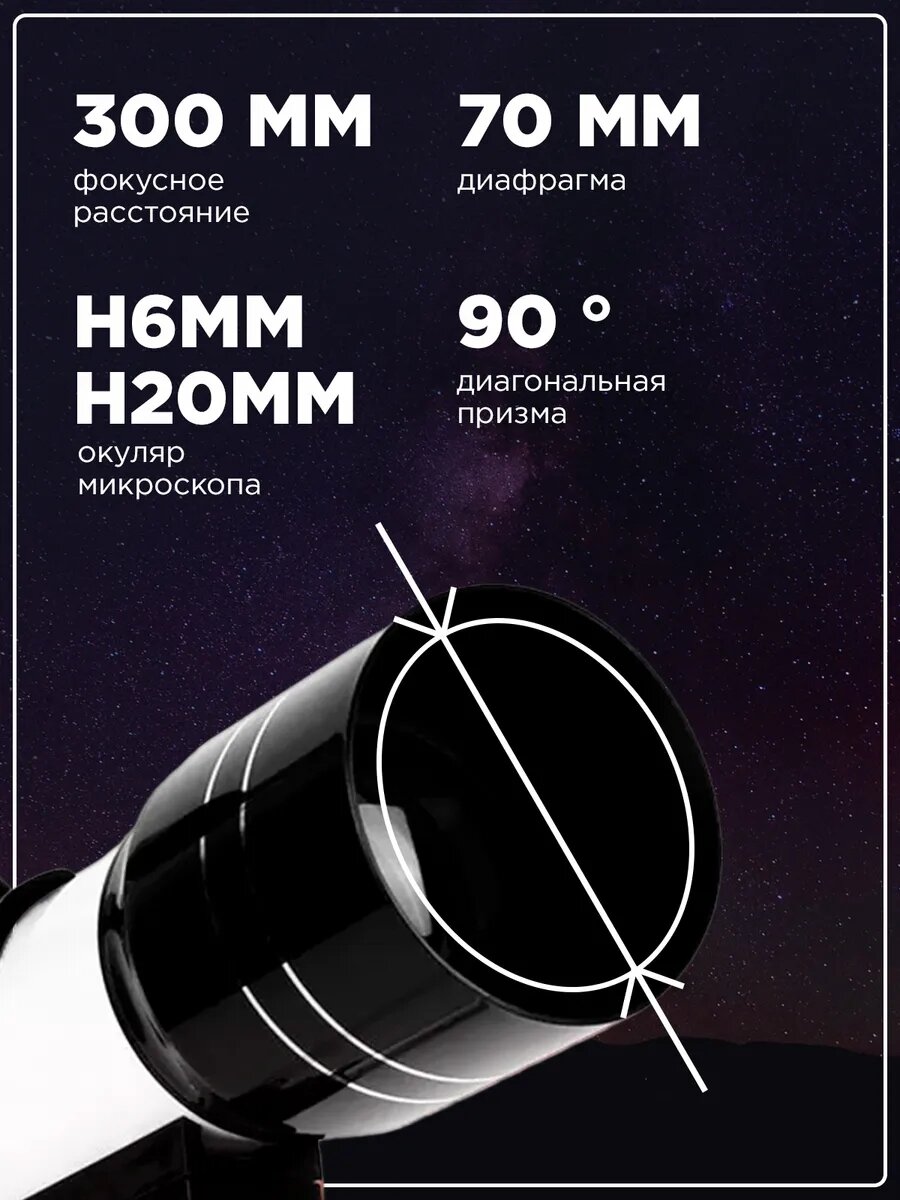 Телескоп — астрономический рефракторный инструмент с апертурой 70 миллиметров и фокусный расстоянием 400 миллиметров, который идеально подходит для знакомства с богатым и удивительным миром космического пространства в ночном небе. С помощью трёхкратных линз Барлоу на данном телескопе возможно достичь максимального увеличения почти в 200 крат. Таким образом, можно обеспечить наблюдение не только ха планетами Солнечной системы, но и за другими отдалёнными космическими объектами. Телескоп специально сконструирован для начального уровня интересующихся космосом так, что требуется минимальная настройка перед наблюдением, что упрощает его использование. Оснащён видоискателем, с помощью которого вы можете без труда найти и навести телескоп на интересующий вас объект. Отметим, что можно использовать ещё и как подзорную трубу в дневное время суток. Вы можете наблюдать за городским пейзажем или природными ландшафтами. Размеры и вес инструмента дают возможность путешествовать вместе с ним за город, на дачу, чтобы насладиться невероятными видами ночного неба и дикой природы. Внимание! Наводить телескоп на Солнце и вблизи его опасно. Не рекомендуется эксплуатация детьми, только в присутствии взрослых.