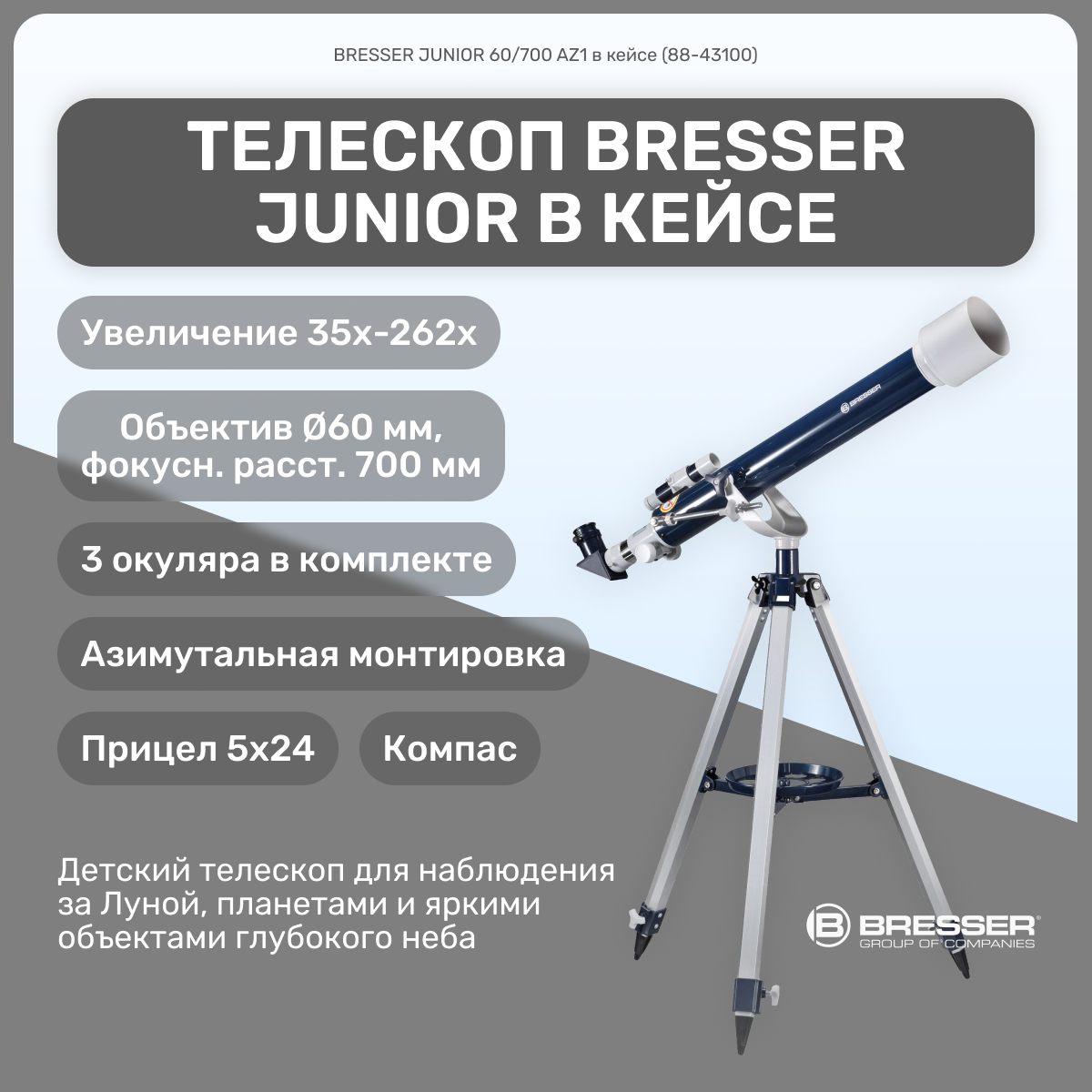 | Комплектация | Телескоп-рефрактор 60/700, Азимутальное крепление, Алюминиевый штатив с плавной регулировкой высоты, Искатель 5x24 мм, Зеркало диагональное 90°, Три окуляра: 4 мм (175-кратное увеличение), 12,5 мм (56-кратное увеличение) и 20 мм (35-кратное увеличение), 1,5-кратная линза Барлоу, Карманный компасЖесткий футляр для переноски |