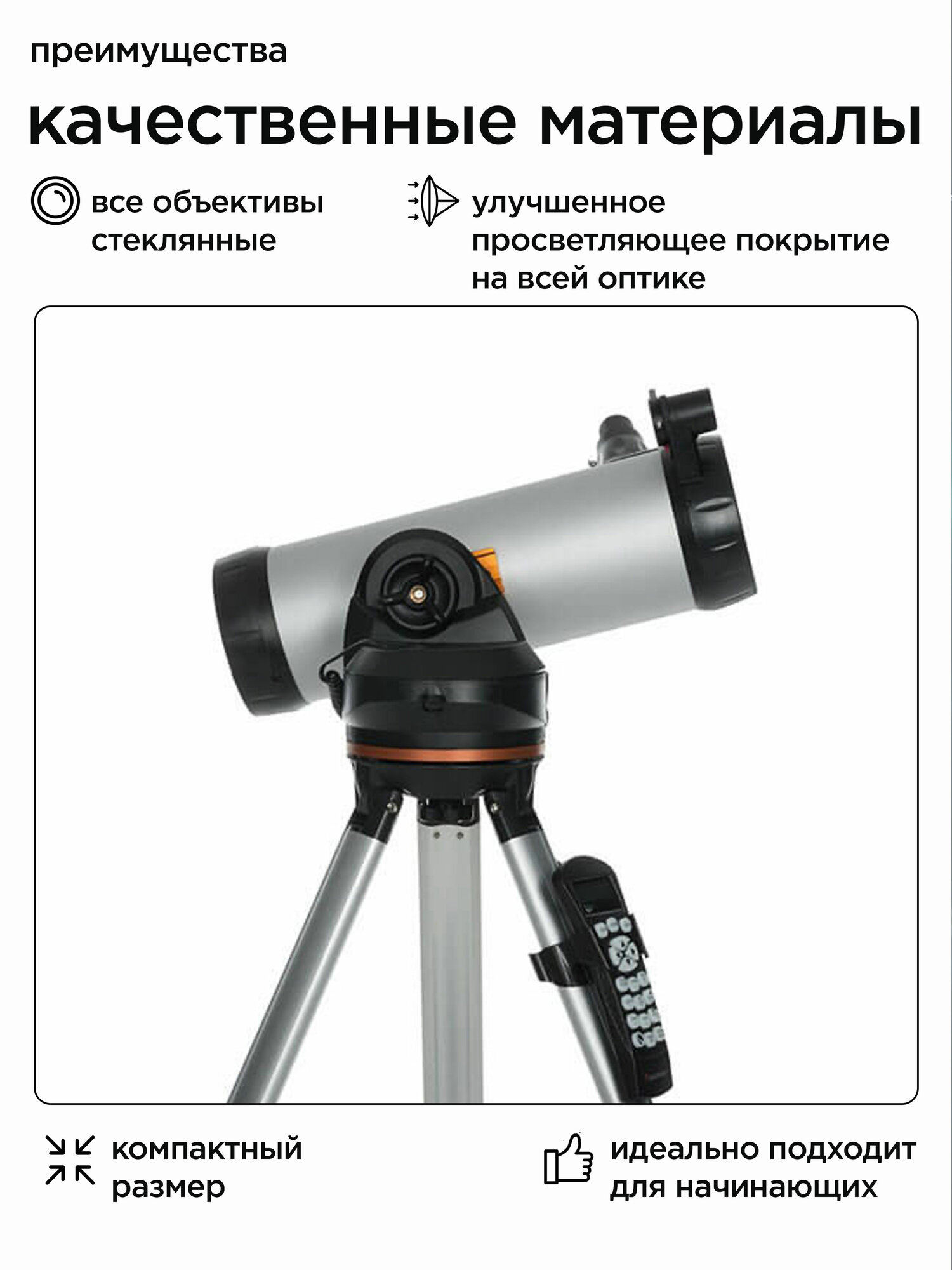 | Комплектация | Телескоп Штатив Монтировка Пульт управления Окуляр 25 мм Окуляр 9 мм Искатель StarPointer |