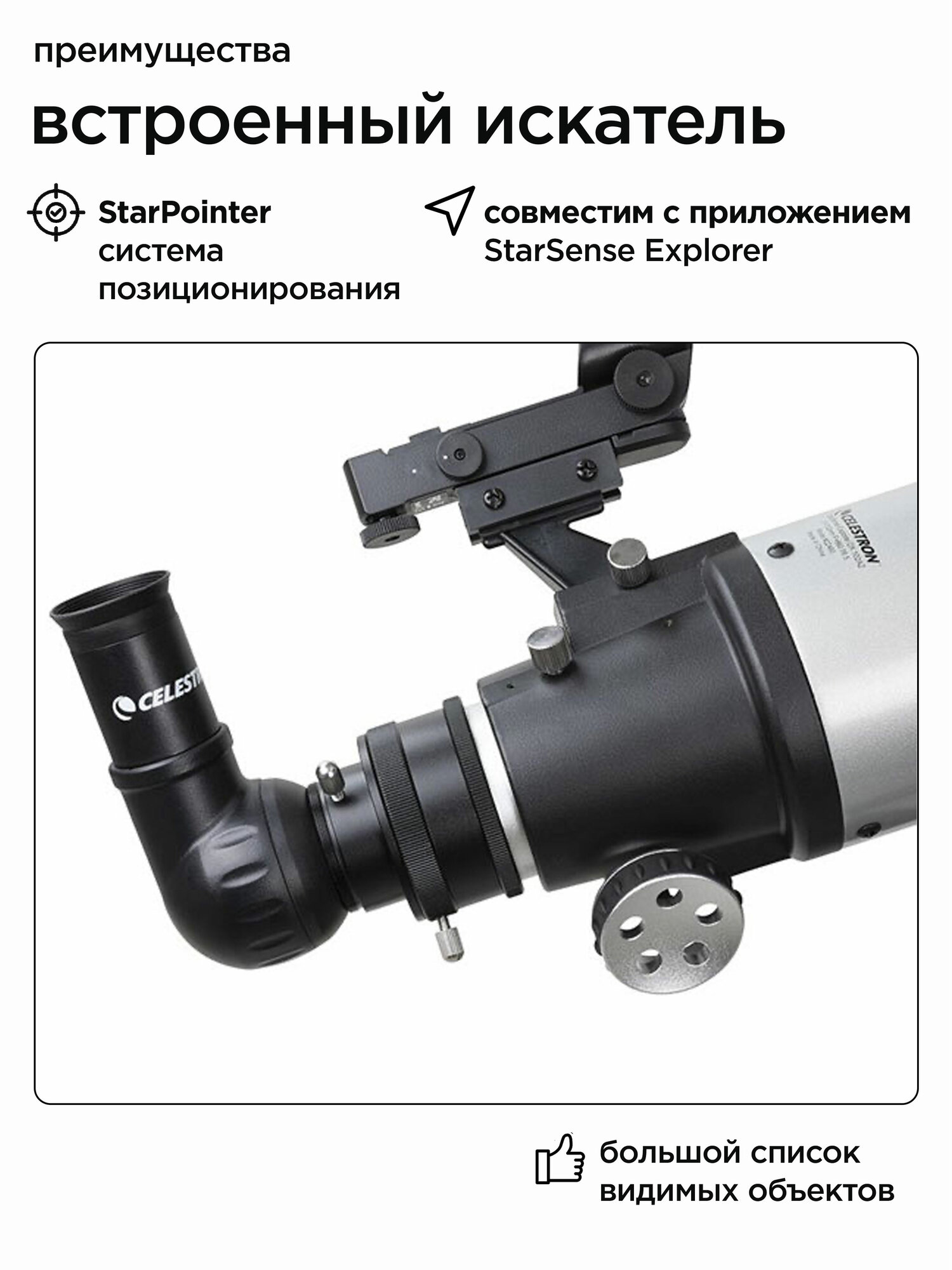 Компания Celestron улучшила телескопы с ручным управлением с помощью держателя для смартфона StarSense Explorer, который позволяет превратить ваш телескоп с ручным управлением в полуавтоматический телескоп, который использует ваш смартфон для анализа ночного неба и позволяет вам в реальном времени найти и навестись на любой объект на ночном небе. Телескоп StarSense Explorer идеально подойдет для начинающих астрономов. Приложение StarSense Explorer покажет Вам все объекты на ночном небе и позволит Вам найти их на ночном небе. Приложение StarSense Explorer Ваш личный гид по ночному небу.