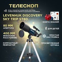 Discovery Channel (Дискавери ченэл) – всемирно известный научно-популярный телеканал о науке, технологиях, исследованиях и приключениях. Захватывающее сочетание историй разных жанров помогает взглянуть под разными углами на людей, места, организации и события, которые формируют наш мир. Discovery вдохновляет миллионы людей во всем мире, предлагая возможность открыть новое и утолить жажду познания. Мы с гордостью представляем серию оптики Discovery, произведенную Levenhuk при поддержке Discovery. Телескоп Levenhuk Discovery Sky Trip ST80 – это компактный рефрактор для первого знакомства с космосом. Он отлично подойдет для выездов за город, где можно вести наблюдения вдали от городской засветки. Кроме того, с этим прибором можно попробовать свои силы в астрофотографии. В комплекте есть иллюстрированная книга знаний «Космос. Непустая пустота» – прекрасное подспорье для тех, кто начинает осваивать астрономические наблюдения. В своей линейке телескоп лидирует по максимальному полезному увеличению: его величина достигает 160 крат. Это позволяет подробно изучать Солнечную систему и увидеть яркие дипскай-объекты: туманности, галактики, звездные скопления.