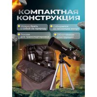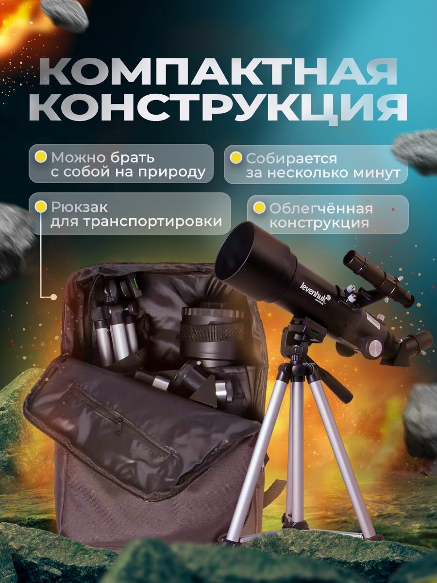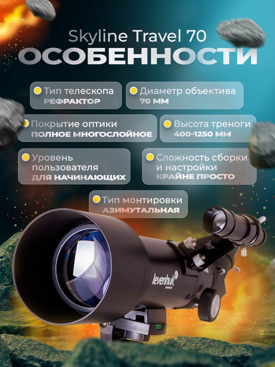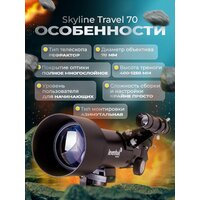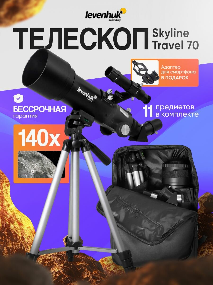 Телескоп Levenhuk Skyline Travel 70 – рефрактор для детей и начинающих астрономов. Он установлен на простую азимутальную монтировку и отлично подходит для изучения Солнечной системы, Луны и объектов дальнего космоса. Вы сможете рассматривать в него и наземные ландшафты, используя телескоп как зрительную трубу. В комплект поставки включен специальный рюкзак для транспортировки, поэтому с Levenhuk Skyline Travel 70 вы сможете даже путешествовать.