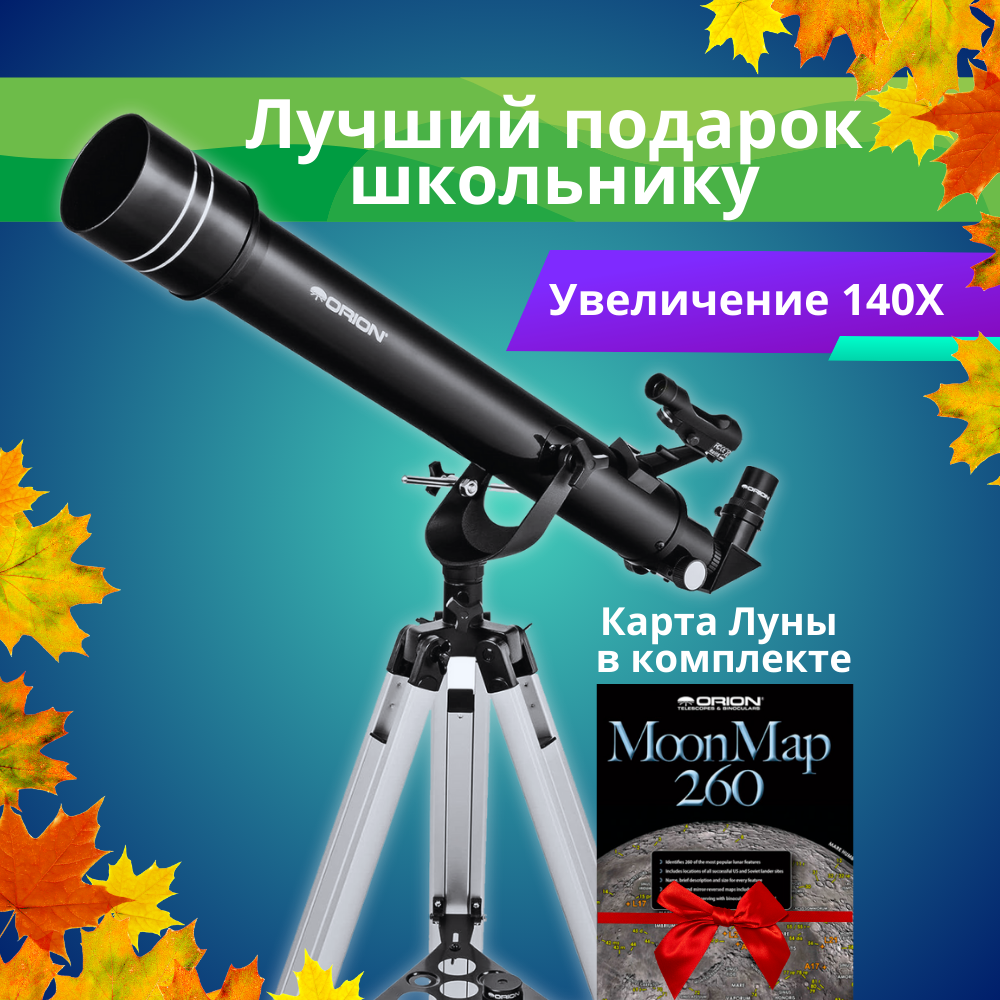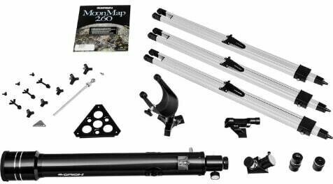 Оптическая труба Orion 70 мм, f/10 Окуляр Kellner 25 мм (1.25") Окуляр Kellner 10 мм (1.25") Диагональное зеркало 90° Альт-азимутальная монтировка Алюминиевая тренога Контейнер для аксессуаров Карта лунной поверхности Orion MoonMap 260