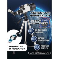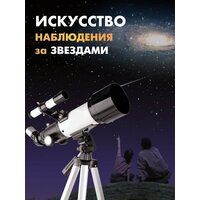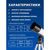 Профессиональный телескоп - рефрактор на азимутальной монтировке - надежный и качественный прибор для наблюдения за объектами звездного неба и Луной, лунной поверхностью и солнечной системой, млечным путем, космосом и планетами: Марсом, Сатурном и Юпитером, наземными объектами Земли с помощью настольного штатива - держателя - подставки. Монокуляр подходит для любознательных детей - школьников и взрослых - исследователей, которые любят наблюдать за светом звезд в ночи, изучать загадки Вселенной через мощный телеобъектив и призму объектива (диаметр телескопической линзы объектива 70 мм) с большого расстояния. Легкая и компактная портативная модель заменит игрушечный бинокль - телескоп прекрасно подходит на роль подзорной трубы: его можно взять с собой в путешествие и для изучения живой природы в рамках орнитологии с детства. Домашний зрительный прибор заменит поход в планетарий, ведь все необходимое для наблюдений за ночным небом можно разместить на домашнем столе или подоконнике. Телескоп - искатель с изображением высокого качества и надежным креплением, простым управлением создан для простых научных экспериментов, домашних исследований и познавательных опытов, для межгалактических приключений и детских космических игр. Классический прибор с четким кратным увеличением - полезная развивашка для первого знакомства с астрономией, развивающая и обучающая игрушка - электроника для начинающих юных астрономов. Набор включает: телескоп и аксессуары: тренога, зеркало с прямым углом, комплект удлинителей (в 1,5 раза и в 3 раза), основная труба, окуляры Н20 и Н6. В приборе использована инновационная технология покрытия линз Startron с максимальным полезным увеличением - 150 крат, максимальное фокусное расстояние - 300 мм. Карта звездного неба в подарок! У нас есть акции и распродажи, вы можете купить наши товары в подарок со скидкой!