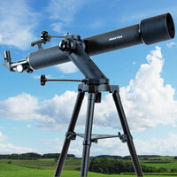 ✪ Телескоп Praktica Deneb 72/800 на альт-азимутальной монтировке станет отличным помощником истинного любителя астрономии в изучении звёздного неба. Земля вращается вокруг своей оси, поэтому при наблюдениях в телескоп объекты постепенно уходят из поля зрения окуляра и приходится всё время перенастраивать телескоп. С телескопом Praktica Deneb 72/800 такой проблемы не будет благодаря альт-азимутальной монтировке с трекером, с помощью ручек трекера можно плавно вести телескоп по вертикали и горизонтали одновременно и удерживать звёздный объект в поле зрения окуляра. Телескоп Deneb 72/800 позволяет качественно наблюдать не только Луну, планеты, но также кольца Сатурна, спутники Юпитера и другие объекты дальнего космоса. Многослойное зелёное покрытие позволяет ему собирать больше света по сравнению с аналогами. Благодаря солнечному фильтру, входящему в комплект, можно также вести наблюдения за Солнцем, а с помощью адаптера для смартфона, также входящего в комплект, можно делать фото своих наблюдений. Телескоп также подходит для ландшафтных наблюдений. Он мобилен, легко собирается. Телескоп изготовлен из материалов стойких к износу. Фирменное нескользящее покрытие предотвращает мелкие повреждения и царапины, а устойчивый штатив сделан из прочной стали, что обычно встречается только у дорогих профессиональных моделей.