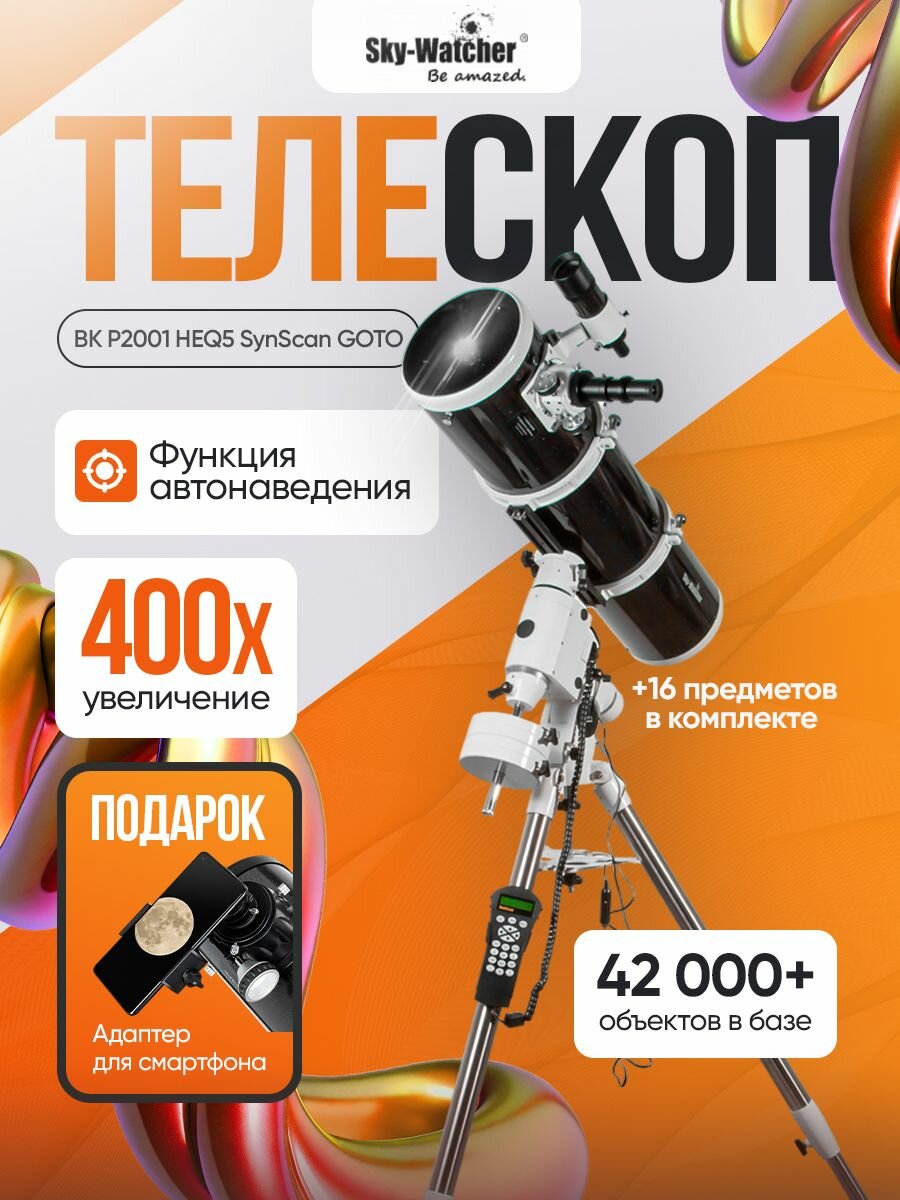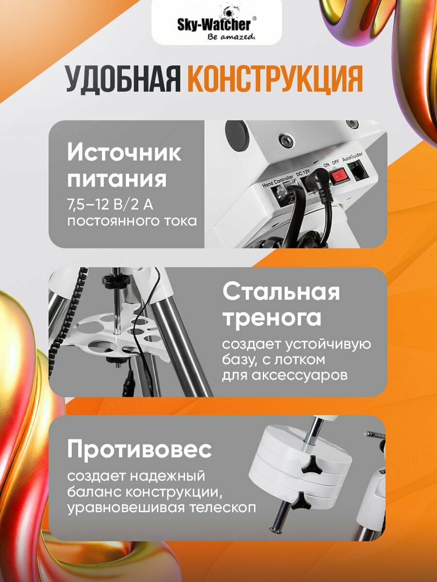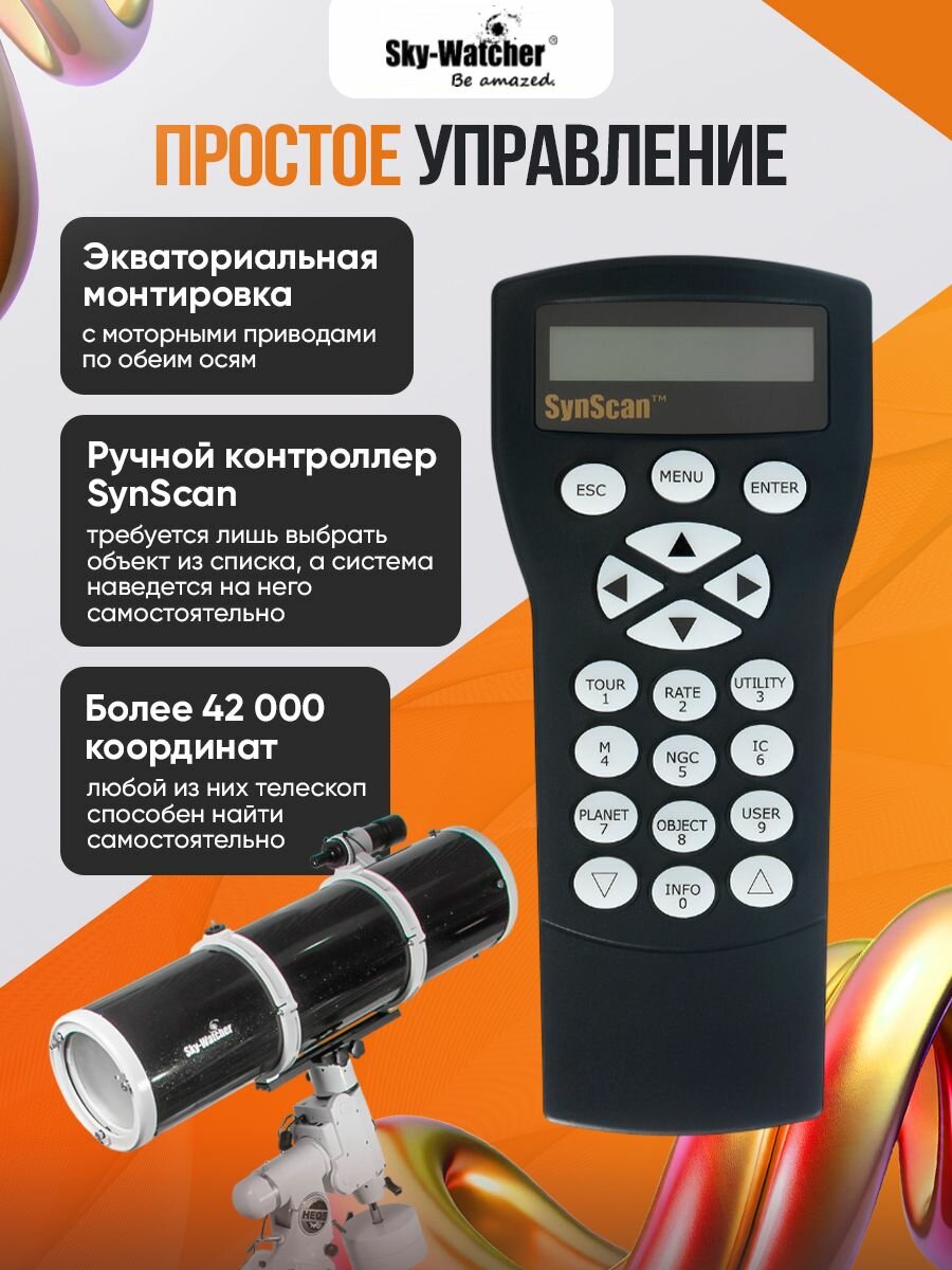 | Дополнительная информация | управление при помощи смартфона или вручную; возможность подключения пульта SynScan; настраиваемый модуль Wi-Fi |