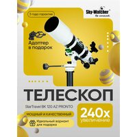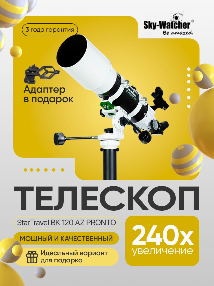 Телескоп Sky-Watcher StarTravel BK 120 AZ PRONTO на треноге Star Adventurer относится к категории рефракторов – телескопов, собирающих свет при помощи системы линз, размещенной внутри конструкции оптической трубы. Устройство рефрактора несложное и не требует специального дорогостоящего обслуживания, при этом прибор может похвастаться достойными оптическими свойствами – в него можно в подробностях рассмотреть текстуры, рельеф и мелкие детали на поверхностях планет. Sky-Watcher StarTravel BK 120 имеет апертуру 120 мм и фокусное расстояние 600 мм, что в совокупности позволяет наблюдателю видеть изображение в сильном увеличении, с большим количеством деталей и с хорошим уровнем четкости. Линзы в объективе Sky-Watcher StarTravel BK 120 имеют многослойное просветляющее покрытие, устраняющее блики, повышающее яркость и контрастность картинки.