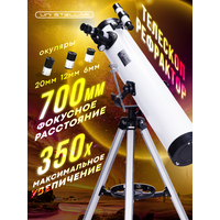 Профессиональный телескоп - рефрактор на азимутальной монтировке - надежный и качественный прибор для наблюдения за объектами звездного неба и Луной, лунной поверхностью и солнечной системой, млечным путем, космосом и планетами: Марсом, Сатурном и Юпитером, наземными объектами Земли с помощью настольного штатива - держателя - подставки. Монокуляр подходит для любознательных детей - школьников и взрослых - исследователей, которые любят наблюдать за светом звезд в ночи, изучать загадки Вселенной через мощный телеобъектив и призму объектива (диаметр телескопической линзы объектива 70 мм) с большого расстояния. Легкая и компактная портативная модель заменит игрушечный бинокль - телескоп прекрасно подходит на роль подзорной трубы: его можно взять с собой в путешествие и для изучения живой природы в рамках орнитологии с детства. Домашний зрительный прибор заменит поход в планетарий, ведь все необходимое для наблюдений за ночным небом можно разместить на домашнем столе или подоконнике. Телескоп - искатель с изображением высокого качества и надежным креплением, простым управлением создан для простых научных экспериментов, домашних исследований и познавательных опытов, для межгалактических приключений и детских космических игр. Классический прибор с четким кратным увеличением - полезная развивашка для первого знакомства с астрономией, развивающая и обучающая игрушка - электроника для начинающих юных астрономов. Набор включает: телескоп и аксессуары: тренога, зеркало с прямым углом, комплект удлинителей (в 1,5 раза и в 3 раза), основная труба, окуляры Н20 и Н6. В приборе использована инновационная технология покрытия линз Startron с максимальным полезным увеличением - 150 крат, максимальное фокусное расстояние - 300 мм. Карта звездного неба в подарок! У нас есть акции и распродажи, вы можете купить наши товары в подарок со скидкой!