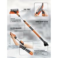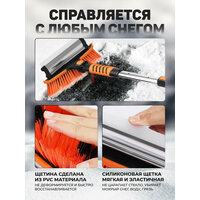 Телескопическая щетка специально спроектирована для очистки больших автомобилей и грузовиков от снега. Длина щетки регулируется от 86 до 150 см, при этом она занимает компактное место в разобранном виде. В щетке использованы только качественные материалы: ABS-пластик устойчивый к низким температурам, EVA материал не дубеющий на морозе, прочный и легкий авиационный алюминий. Щетка предназначена для много сезонного использования. Щетку можно разобрать и хранить в сумке, которая идет в комплекте. Щеткой удобно убирать снег, жидкую грязь, воду, соскребать лед и дробить лед. Щетина щетки плотная, в широком месте имеет 7 рядов. Щетина имеет 2 уровня: высокий внешний, выполненный из мягкой щетины – для уборки легкого снега и низкий внутренний, выполненный из плотной жесткой щетины, которая помогает убирать затвердевший снег. С обратной стороны щетины установлена силиконовая щетка, предназначенная для сгона воды, жидкой грязи. Положение щетки можно менять на 270 градусов и использовать в 3х разных позициях. Мощный и широкий двойной скребок поможет раскрошить и сбить наледь. Ручка щетки выполнена из мягкого, не дубеющего EVA материала, имеет массивную овальную форму. Края щетки с щетиной защищены мягким силиконом, чтобы не царапать ЛКП. Щетка призвана справляться с большими объемами снега. В комплекте идет 5 составных частей щетки и сумка для хранения разобранной щетки. Вес 998 гр.