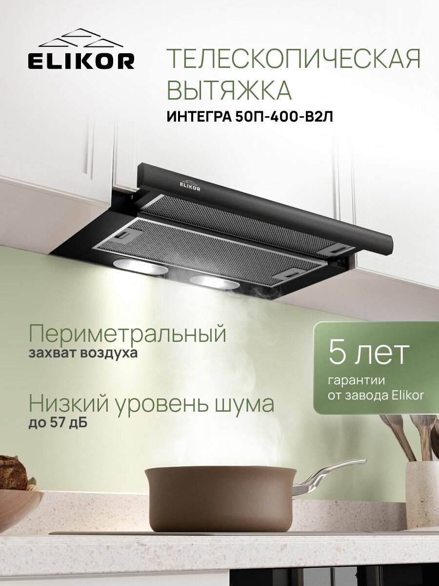 Телескопическая вытяжка ELIKOR Интегра 50П-400-В2Л 50 см, 400 м3/ч, 2 скорости, режимы отвод и рециркуляция, алюминиевый жировой фильтр и 2 лампы, черный: сравнение цен, характеристики, фото, актуальное наличие и цены.
