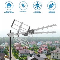 Активная внешняя антенна Harper ADVB-3272 может применяться в условиях пригородных районов на существенном удалении от источников сигнала – до 95 км при прямой видимости (при отсутствии преград или помех на пути до ретранслятора). Коэффициент усиления составляет 32 дБ при уровне шума менее 4 дБ. Таких показателей позволяет добиться особая пространственная конструкция с двухлучевой траверсой и малошумящий усилитель, питающийся напряжением 5 В. Антенна легко устанавливается своими силами. Питание к усилителю может подаваться как напрямую от ТВ-ресивера, так и от любого USB-порта (специальный USB-инжектор входит в комплект). Антенна выполнена из высококачественного алюминия повышенной прочности, обеспечивая надежность, легкость и долговечность конструкции. Предназначена для использования вне помещения. Не ржавеет, устойчива к УФ-излучению и осадкам.