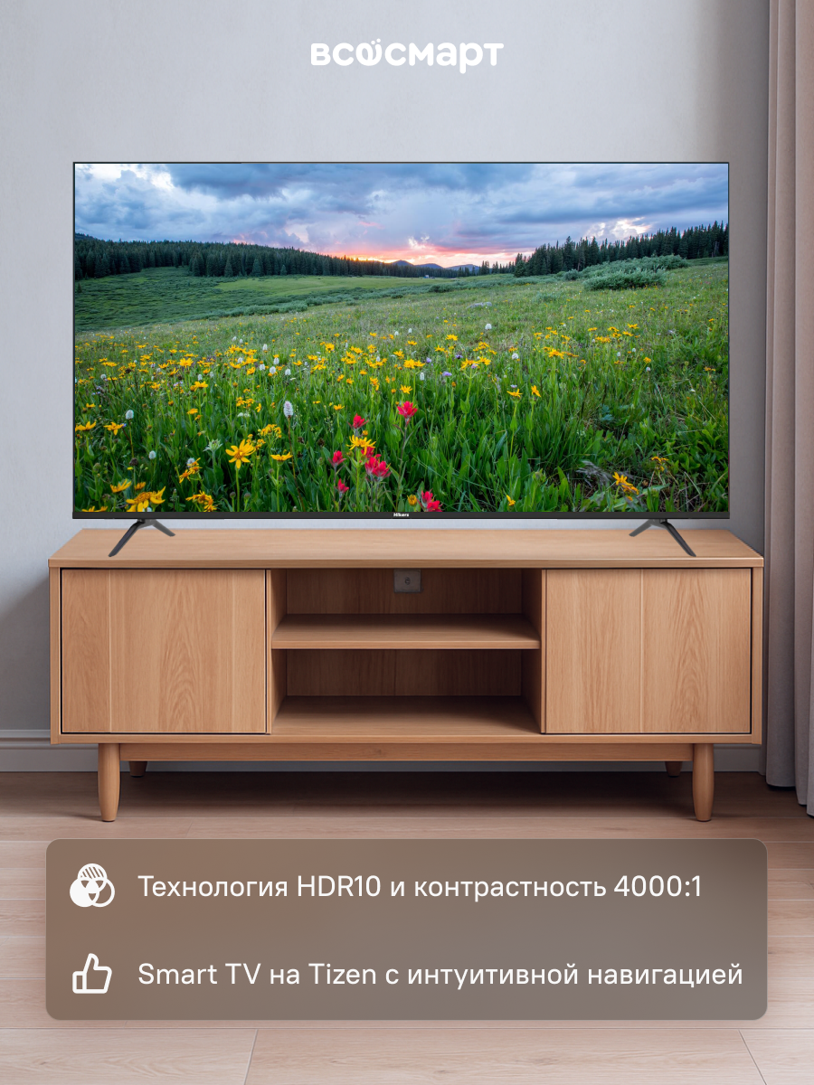 Купить Телевизор 50″ со Смарт ТВ Hikers 50HTU01 4K UHD, Smart TV, Wi Fi, Bluetooth, TIZEN OS, MEMC, Dolby Audio, HDR, DLED с доставкой по всей России.
