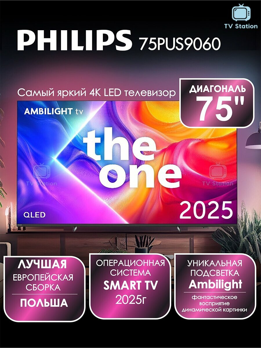 Купить Телевизор 75 Philips 75PUS9060, QLED, 4K UHD, Titan OS, Ambilight с доставкой по всей России. Телевизор 75 Philips 75PUS9060, QLED, 4K UHD, Titan OS, Ambilight: сравнение цен, характеристики, фото, актуальное наличие и цены.