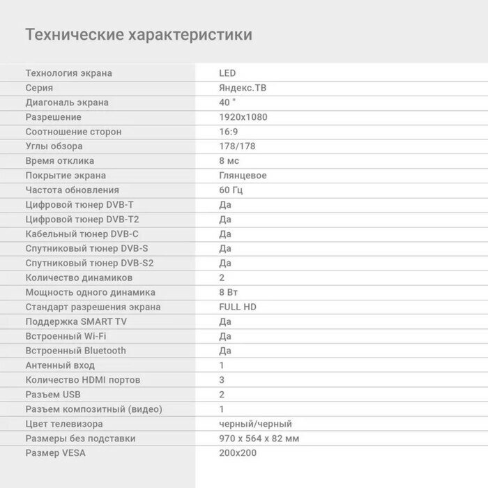 | Разъемы и интерфейсы | AV-вход, Ethernet - RJ-45, USB Type-A, USB Type-A x 2, вход HDMI, вход HDMI x 3, вход VGA, вход аудио, выход на наушники, композитный видеовход, слот CI/CI+ |