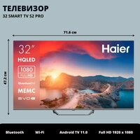 Телевизор Haier 32 Smart TV S2 Pro оснащен экраном 32 дюйма, имеет тонкий матовый корпус черного цвета, стильные и эргономичные ножки. Дисплей с подсветкой HQLED позволит насладиться максимально чистым и ярким отображением чёрного, белого, красного, зелёного и синего цветов. Дисплей телевизора обладает разрешением 1920 х 1080 пикселей, качество — Full HD. Технология HDR10 позволяет отразить на экране всю глубину цветов, что способствует высочайшей детализации любой сцены. Частота обновления экрана 60 Гц. Функция Simulated Surround Sound создает объемное трехмерное звучание без установки специального оборудования. Телевизор работает на операционной системе Android TV 11-й версии, поддерживает управление с помощью голосового ассистента Google и трансляцию контента с телефона на экран телевизора при помощи технологии Chromecast. Общие данные: Габариты (без подставки): 42.9x71.6х8.2 см Габариты (с подставкой): 47.2x71.6x21.1 см Диагональ: 32" Разрешение: 1920x1080 Яркость: 250 кд/м2 Контратность: 4000:1 Время отклика: 6.5 мс Количество цвтов: 16.7 млн Угол обзора по горизонтали/вертикали: 178/178° Разъемы (вход): антенныйx2, HDMIx3, USBх2, RJ45, CI Разъемы (выход): оптический, наушники Изображение: Светодиодная (LED) подсветка Соотношение сторон: 16:9 Частота обновления экрана: 60 Гц HDR10 Системы вещания: Тип тюнера: аналоговый, цифровой DVB-C, DVB-T, DVB-T2, DVB-S, DVB-S2 Smart TV: Операционная система: Android TV 11 Процессор: ARM Cortex Advanced quad-core Графический процессор: ARM Advanced Multi-Core Mali Оперативная память: 1 ГБ Встроенная память: 16 Гб Wi-Fi: встроенный Стандарт Wi-Fi: 802.11 (a, b, g, n, ac) Bluetooth: 5.1 Звук: Мощность акустической системы: 20 Вт Тип динамика: 2.0 канала Дополнительная информация: Пульт ДУ EPG Версия HDMI: 1.4 Версия USB: 2.0 Тип блока питания: встроенный Энергопотребление в рабочем режиме: 60 Вт Энергопотребление в режиме ожидания: 0.5 Вт Цвет корпуса: черный Вес с подставкой: 3.7 кг Вес без подставки: 3.6 кг Крепление на стену VESA (мм): 200x100 Внимание: крепление в комплект не входит и приобретается отдельно!