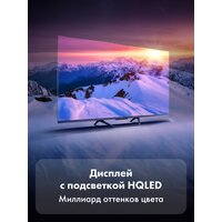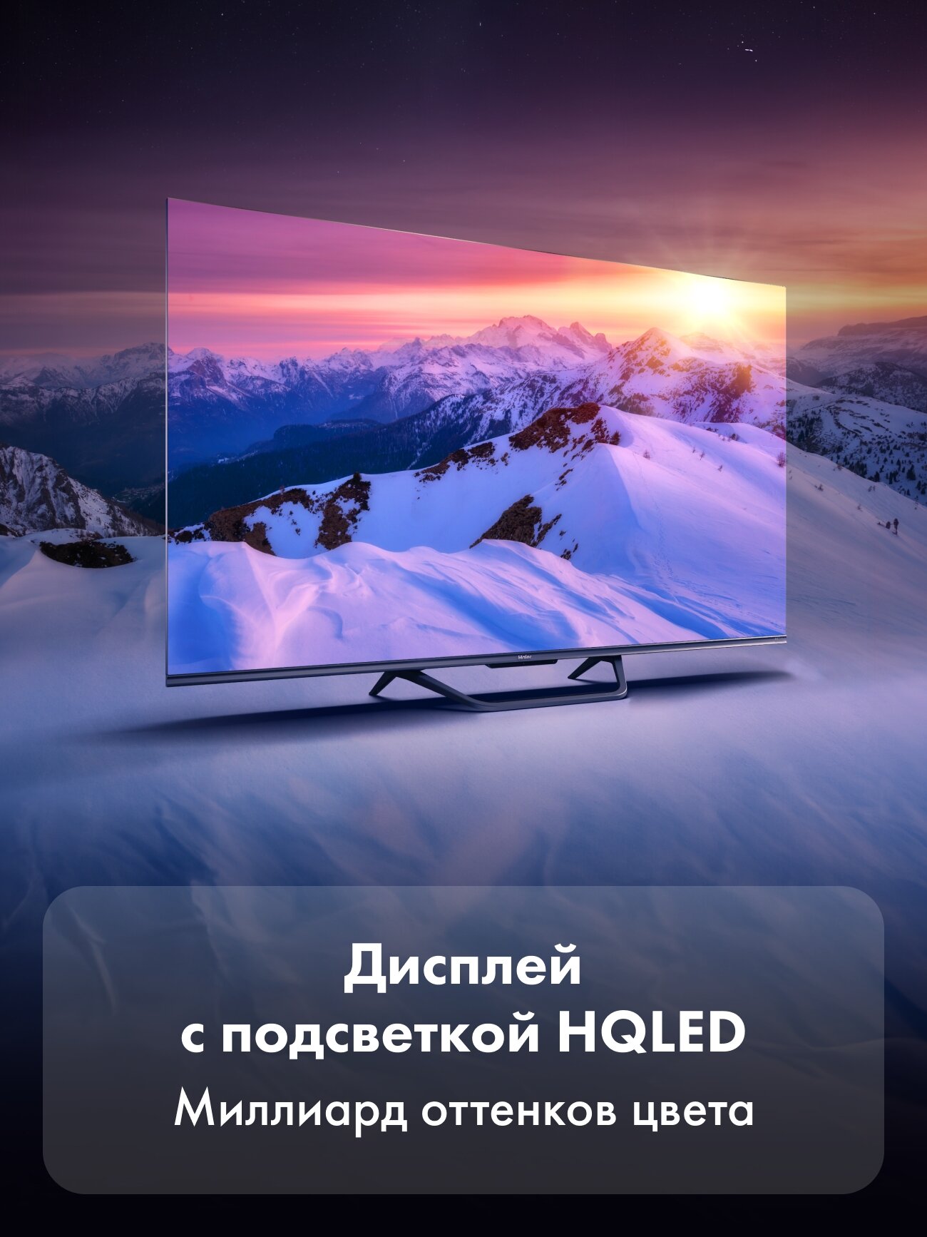 Широкоформатный HQLED-экран диагональю 50 дюймов (127 см) демонстрирует изображения разрешением 4К UHD. Частота обновления кадров составляет 60 Гц, яркость достигает 320 нит. Углы обзора - 178°, по горизонтали и вертикали. Оптимальное расстояние для просмотра видеоконтента - 1,9-3,8 м. Технология HDR10 способствует отображению видео с высокой битностью, широким цветовым охватом и расширенным динамическим диапазоном. Мемс придает кадрам четкость и плавность. Цифровое шумоподавление и масштабирование контента до разрешения 4K повышают качество видео.