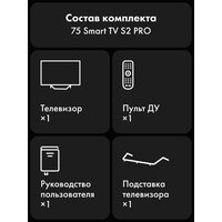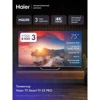 Телевизор Haier 75" S2 Pro - это большой 75–дюймовый экран, превращающий любую комнату в домашний кинозал. Разрешение 4K UHD (3840×2160), технология QLED и яркость 350 кд/м² обеспечивают насыщенное, детализированное изображение с глубокими цветами и чёткими тенями. HDR10 и контрастность 6000:1 усиливают передачу света и теней, а углы обзора 178° гарантируют комфортный просмотр с любого места.