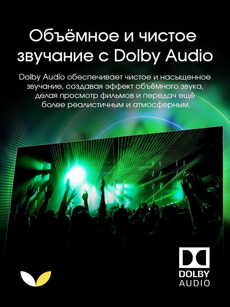 Современная аудио технология Dolby Audio обрабатывает и улучшает звук любого типа контента: фильмы, спортивные передачи или потоковое видео. Благодаря этой встроенной системе вы получите двухмерный качественный и насыщенный звук.