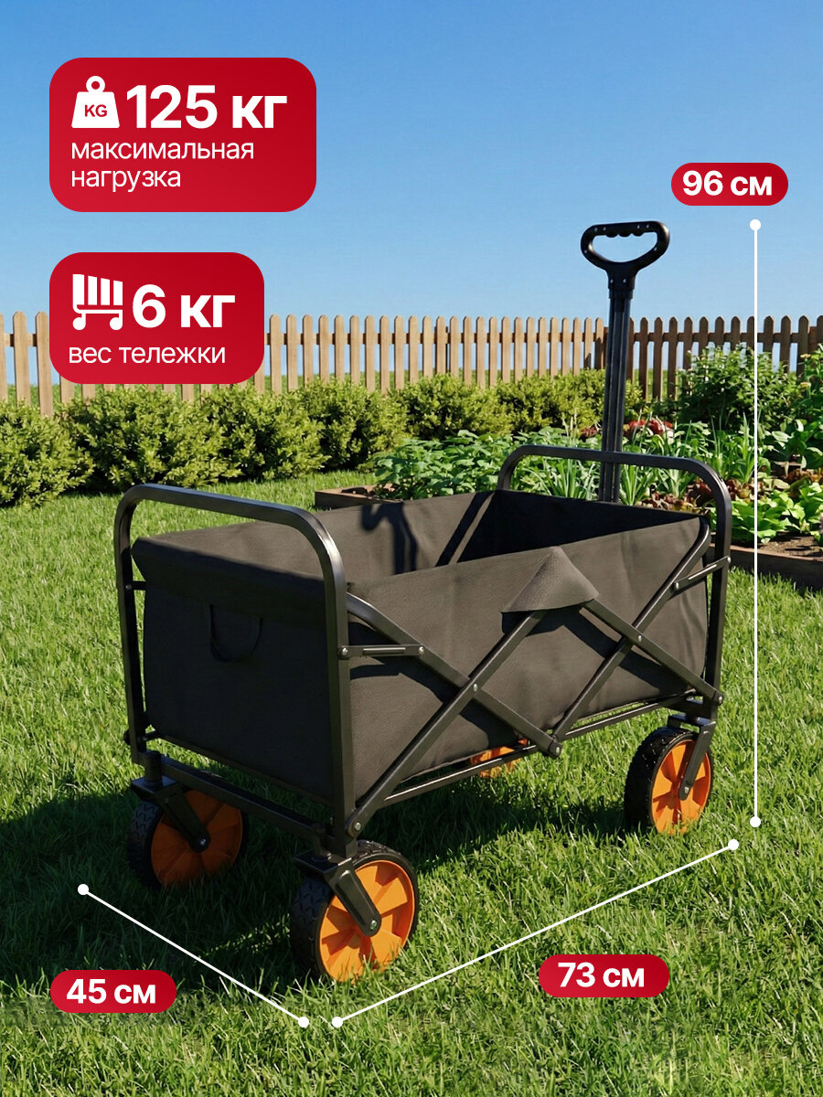 Тележка DFC SQ-WT01 с оранжевыми колесами — это универсальная коляска-трансформер для сада, кемпинга и активного отдыха. Она сочетает в себе практичность, прочность и удобство. Незаменимый помощник для загородных поездок, пикников, дачи или пляжа. Бытовая тележка рассчитана на максимальную нагрузку до 125 кг, благодаря чему вы легко сможете перевозить всё необходимое — от багажа и еды до оборудования и игрушек. Так же присутствуют карманы и удобная рукоятка, которая регулируется от 75,5 до 99,5 см и фиксируется защелкой. Прочная рама из железа обеспечивает надёжность и долговечность конструкции, а износостойкий тканевый материал ПВХ устойчив к погодным условиям и легко чистится. Садовая тележка выдержит как неровности походной тропы, так и жаркий пляжный песок, сохранив форму и внешний вид. Компактный размер тележки в сложенном виде позволяет удобно хранить и перевозить её даже в багажнике легкового автомобиля. Механизм сборки простой и интуитивно понятный — складная тележка готова к работе за считанные секунды. Тележка DFC SQ-WT01 удобна, прочна и проста в использовании. Легко складывается, занимает минимум места и подходит для перевозки вещей на даче, пикнике или отдыхе. Маневренные колёса и вместительность делают её отличным помощником на каждый день. Гарантия на детали подверженные естественному износу в процессе эксплуатации — до 6 месяцев с момента установки тренажера при условии регулярного планового ТО. Важно: гарантия не распространяется на преждевременный износ из-за чрезмерной эксплуатации тренажера.