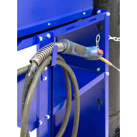 Сзади тележки расположена площадка для газового баллона до 40 литров, которую можно зафиксировать с двух сторон цепью. Сварочный столик оснащен средней и нижней полками, на которых можно разместить рабочий инструмент.