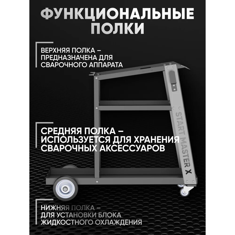START MASTER X - Когда всё под рукой! Тележка Start Master X — это универсальное решение для комфортной работы со сварочным оборудованием. Она обеспечивает удобное хранение и транспортировку сварочного аппарата, блока охлаждения, газового баллона и аксессуаров. Конструкция выполнена из прочного металла, что гарантирует надежность и долговечность. Благодаря удобному расположению полок и дополнительных креплений все необходимые инструменты всегда будут под рукой. Три функциональные полки: Верхняя полка – предназначена для сварочного аппарата, расположение на высоте облегчает доступ к управлению. Средняя полка – используется для хранения сварочных аксессуаров, таких как проволока, электроды, защитные перчатки и другие принадлежности. Нижняя полка – специально разработана для установки блока жидкостного охлаждения. Полезные аксессуарыДополнительно на тележке предусмотрены крючки, которые позволяют удобно разместить сварочную горелку и маску, обеспечивая порядок на рабочем месте. Универсальный подходТележка оснащена прочной металлической площадкой для безопасного размещения газового баллона объемом 10, 20 или 40 литров. Для дополнительной фиксации в комплекте предусмотрены ремни, которые надежно удерживают баллон на месте, предотвращая его опрокидывание во время работы или перемещения.